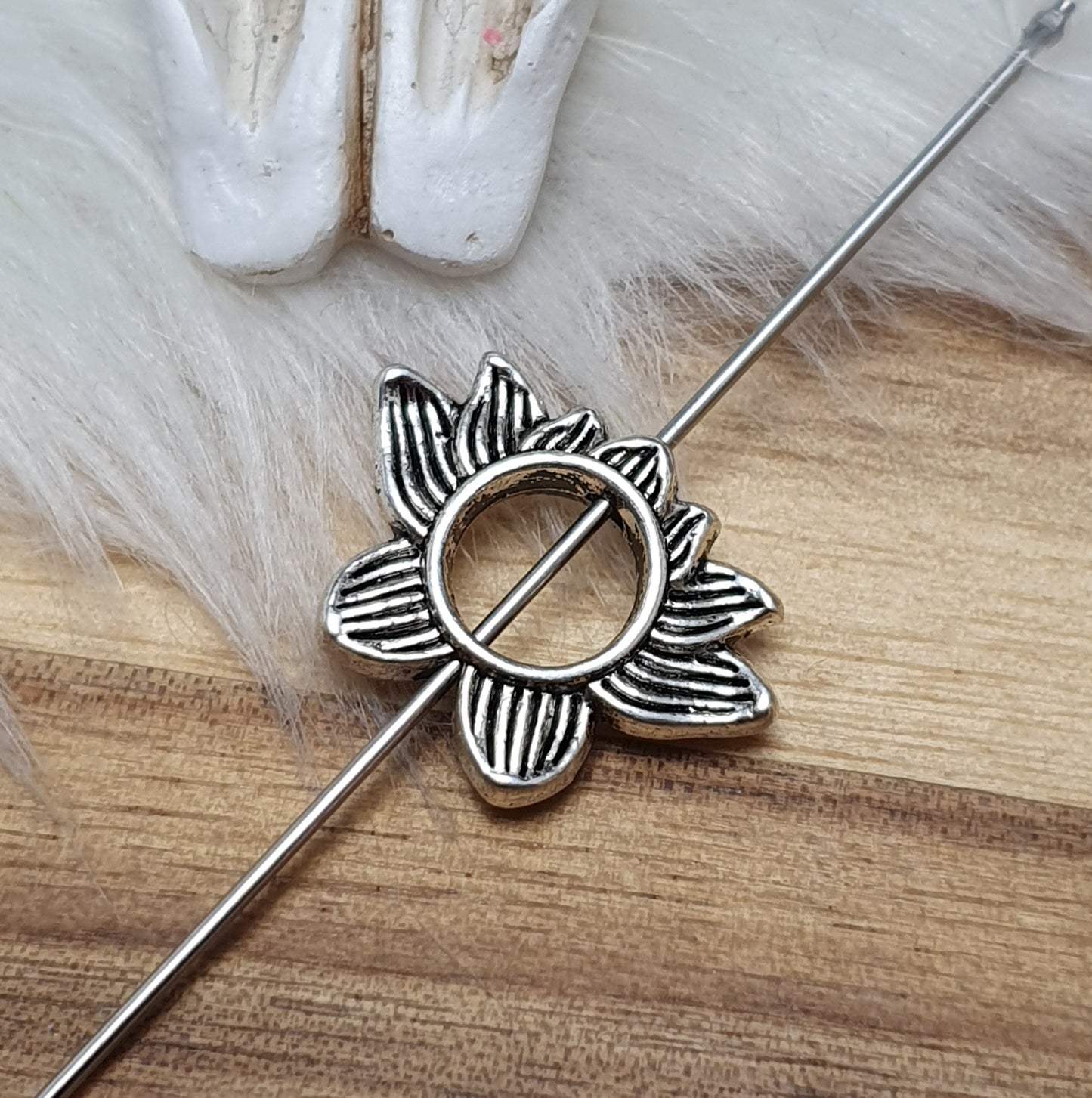 Eine große Metallperle in Form einer Lotusblüte.