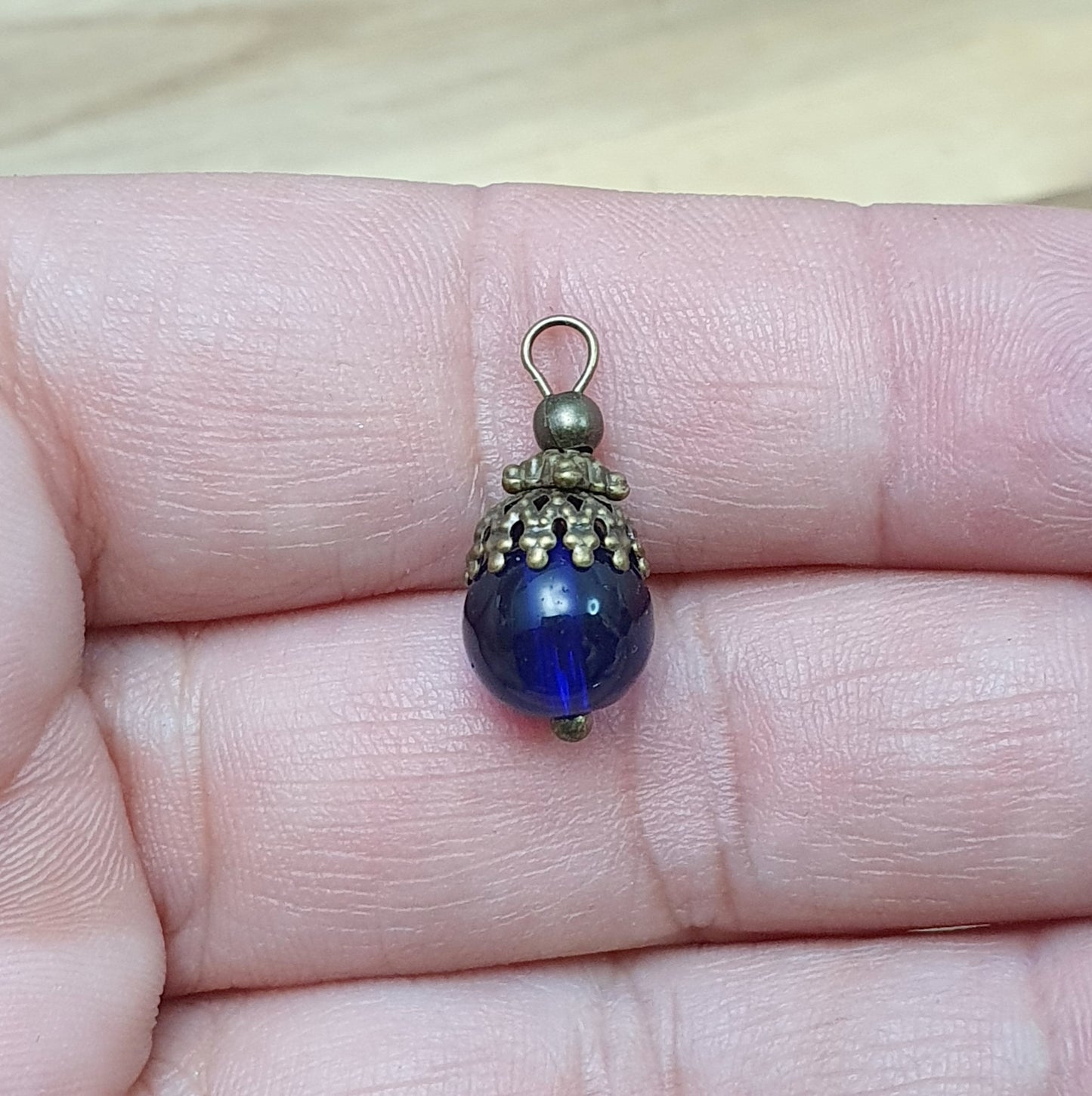 Diese handgefertigten Anhänger sind aus dunkelblauen Glasperlen mit antik bronzefarbigen Metallelementen gefertigt und 23mm lang. Die Glasperlen sind transparent und haben ein tiefes dunkelblau.