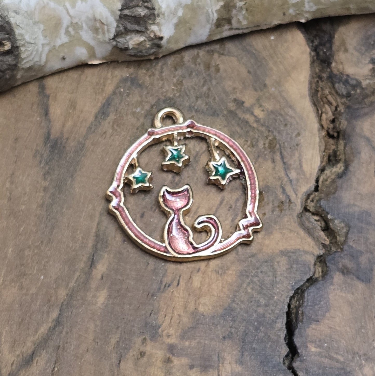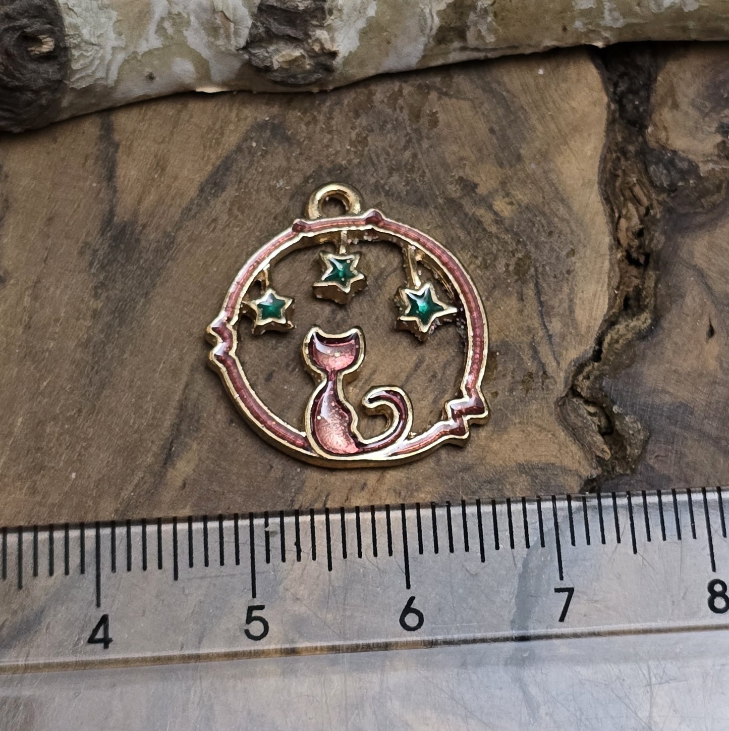 2 kleine Anhänger rotes Kätzchen mit grünen Sternen - goldfarbig 21mm