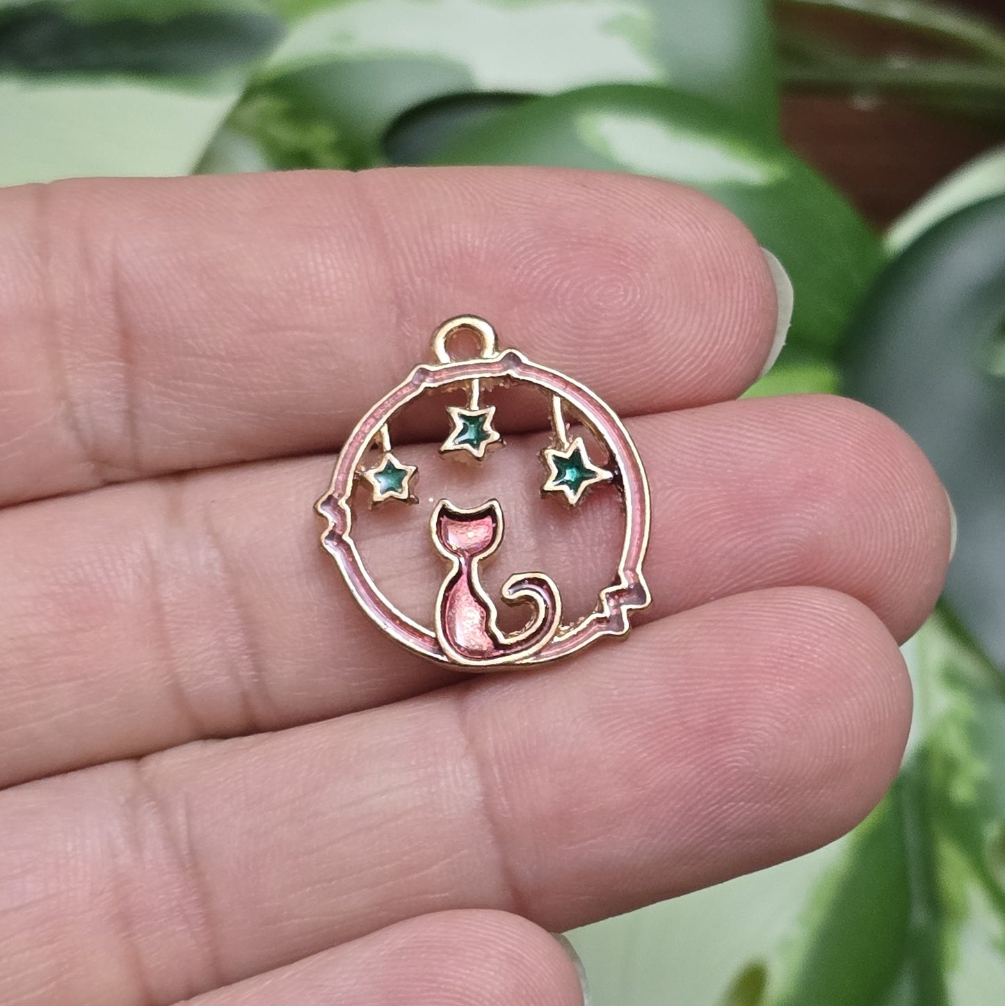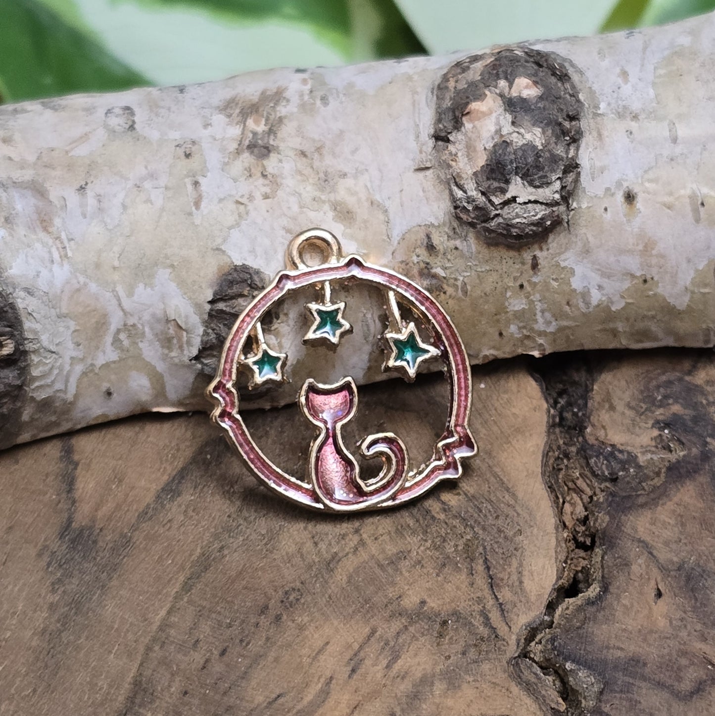 Diese goldfarbenen Anhänger (21mm) mit einer glitzernden roten Katze und grünen Sternen verleihen deinem Schmuckprojekt einen verspielten, aber eleganten Touch. Die leuchtenden Farben und das magische Design machen diese Anhänger zu einem echten Hingucker – ideal für Ketten, Armbänder oder Ohrringe!