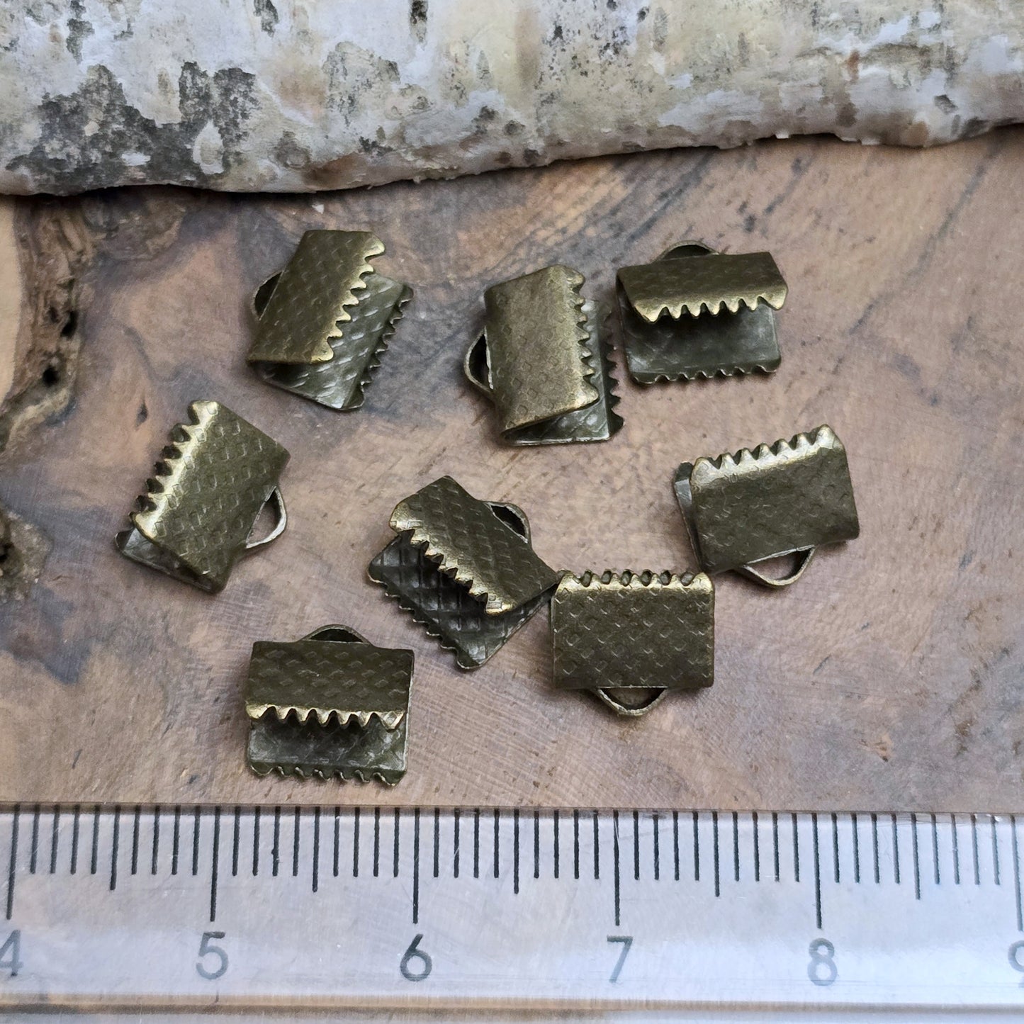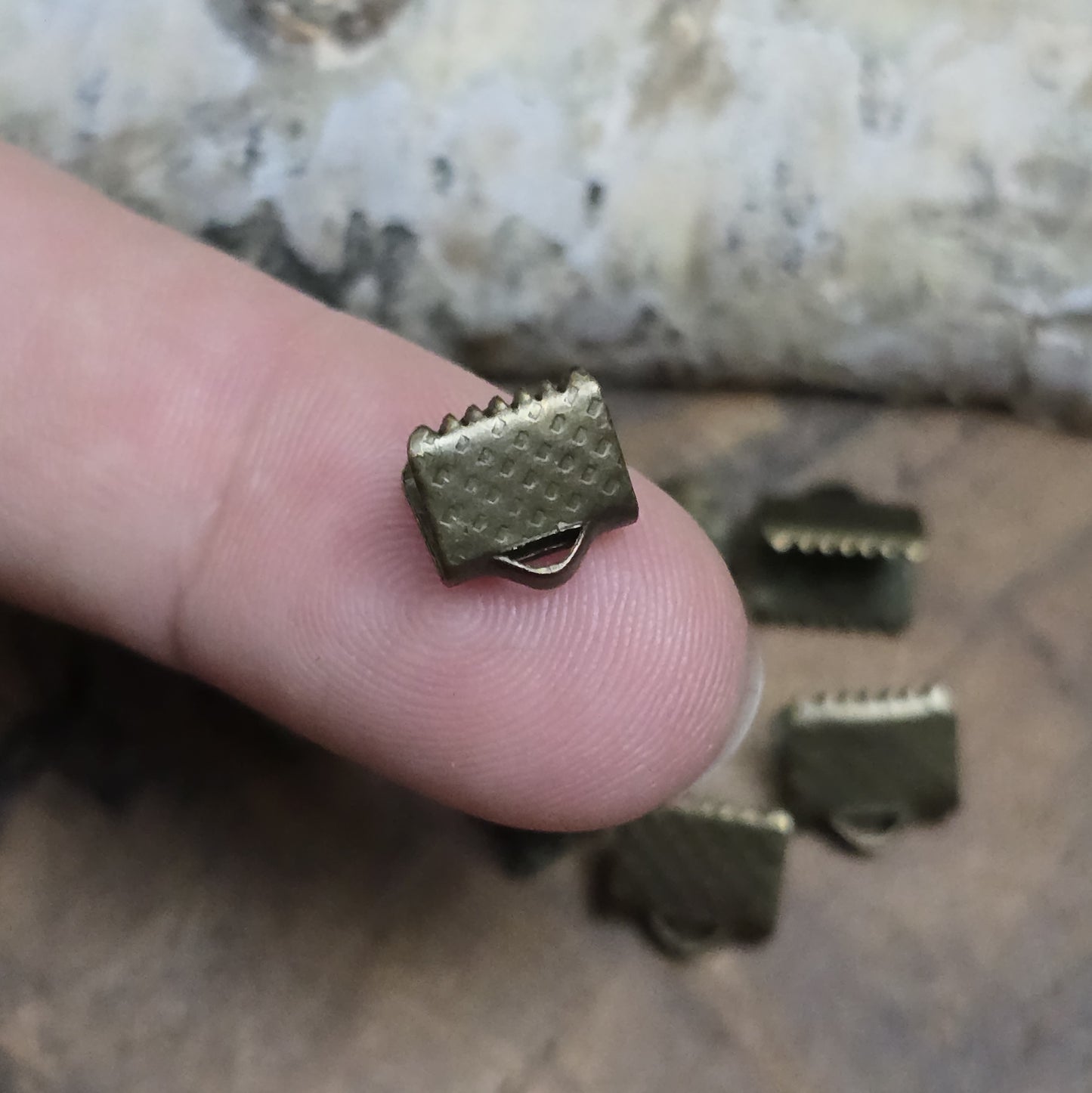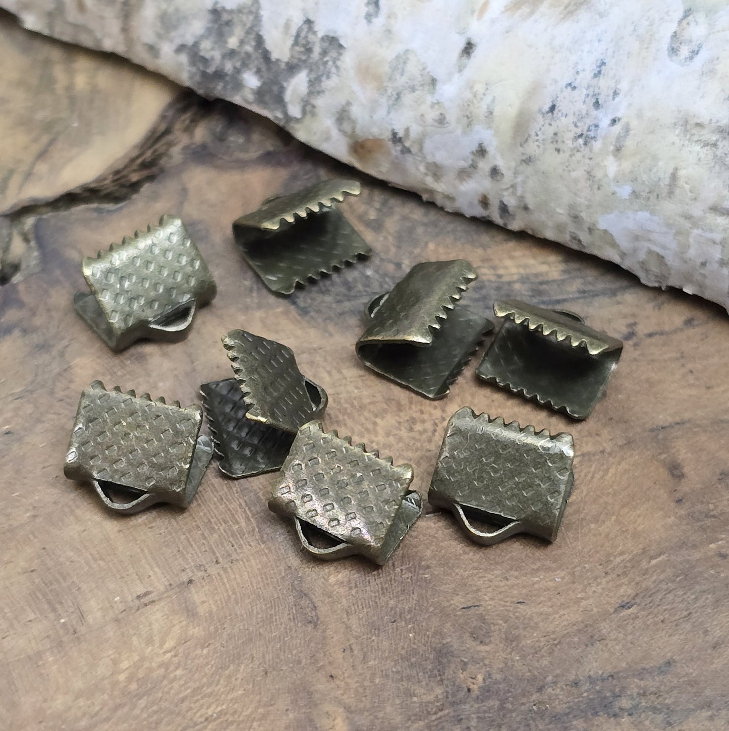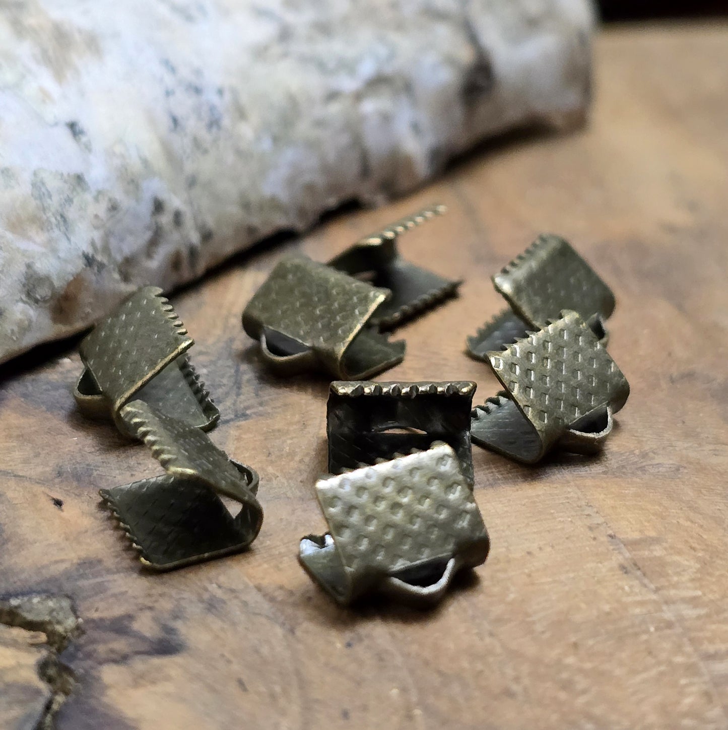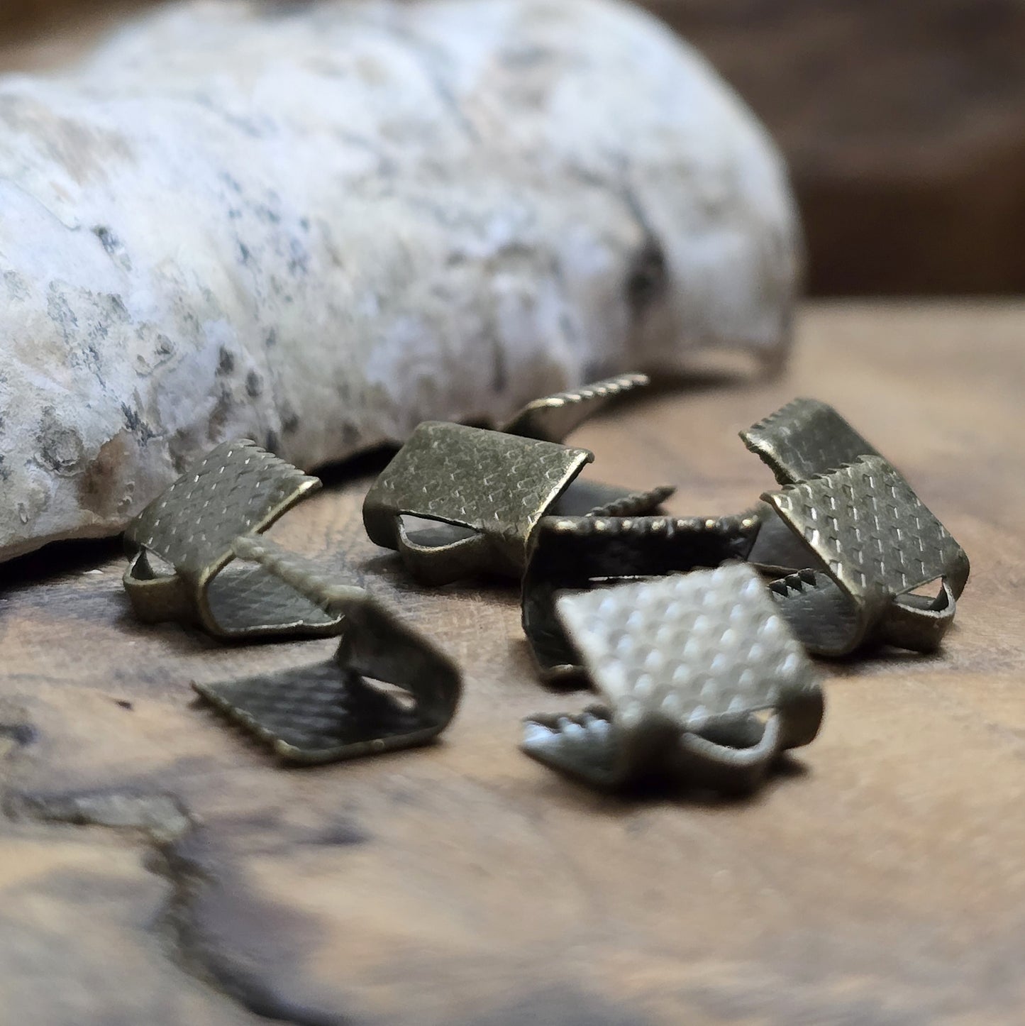 Diese Bandklemmen sind perfekt, um Verschlüsse an Stoffbändern wie Samt oder Satin anzubringen. Einfach mit einer Zange am Bandende fixieren und anschließend Verschlüsse oder Ösen an der integrierten Öse befestigen.