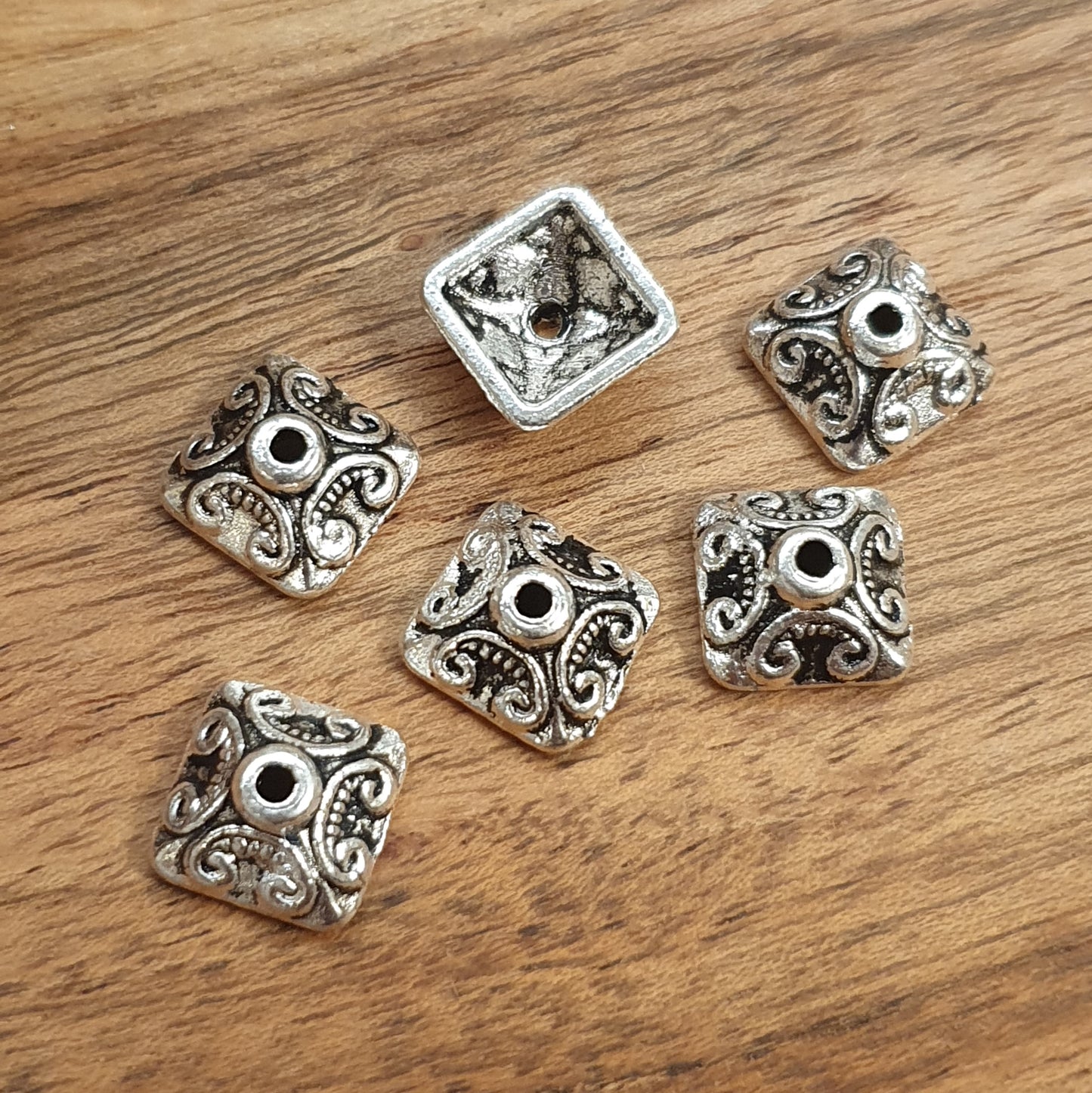 6 quadratische Perlenkappen in antik silberfarbig, 10mm