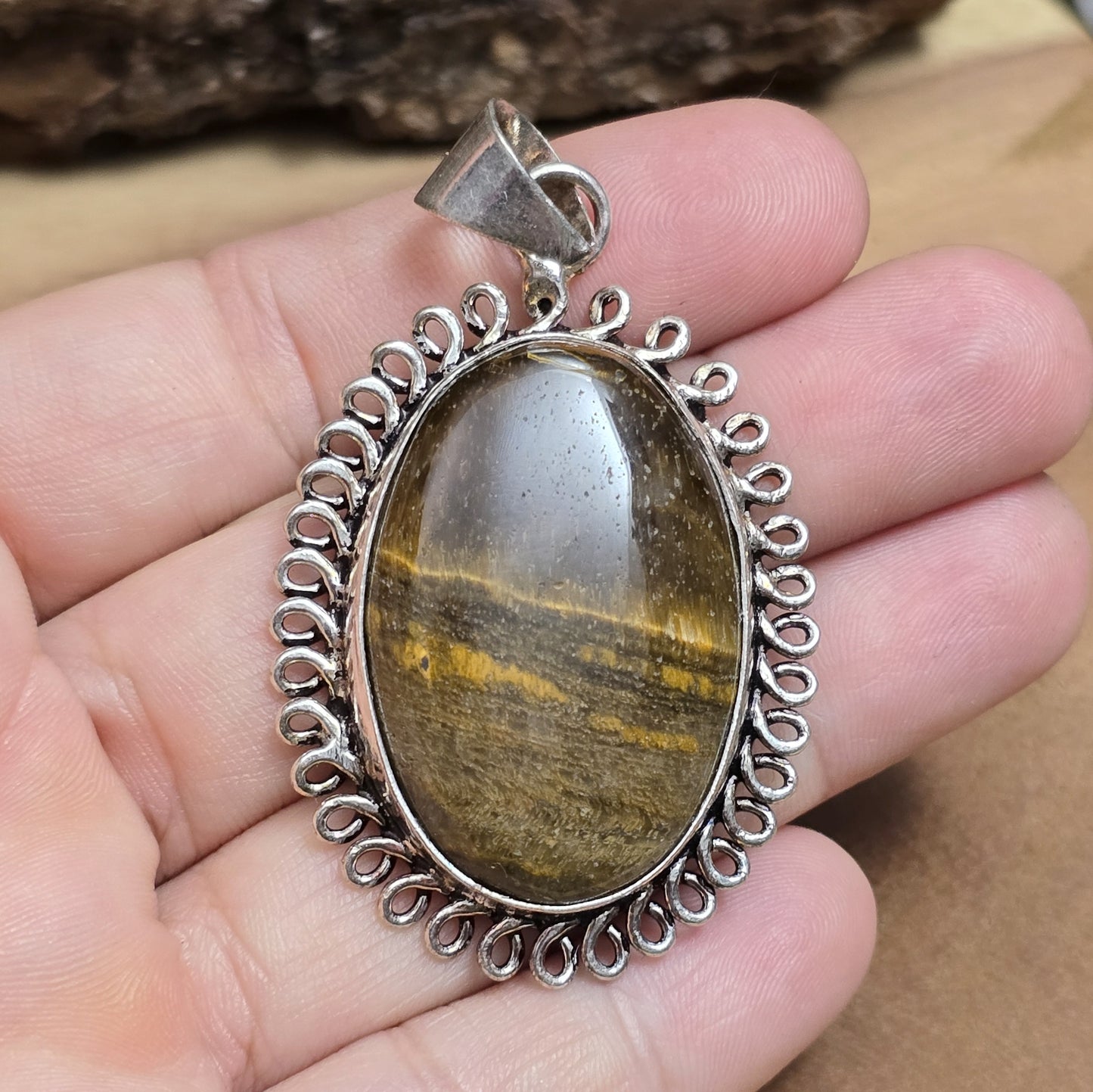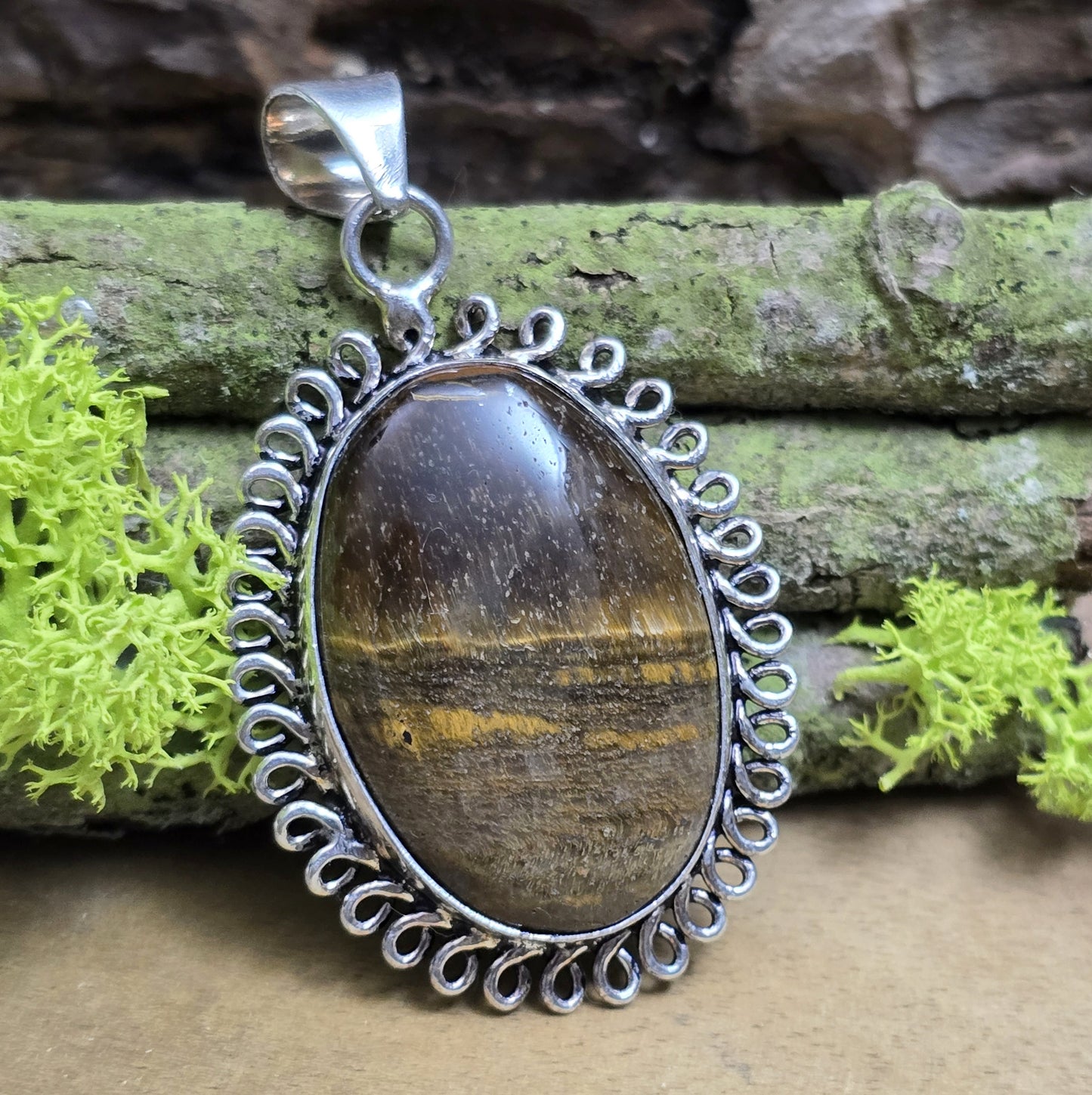 Dieser majestätische Anhänger aus .925 Sterling Silber, verziert mit einem großen, ovalen Tigerauge, ist ein Amulett voller mystischer Kraft und tiefer Weisheit. Das Tigerauge, bekannt als „Auge des Schutzes“, funkelt in goldenen und braunen Tönen, wie das Licht, das durch einen dichten Wald bricht. Es ist ein uralter Stein, der den Mut und die Stärke der Erde in sich trägt.