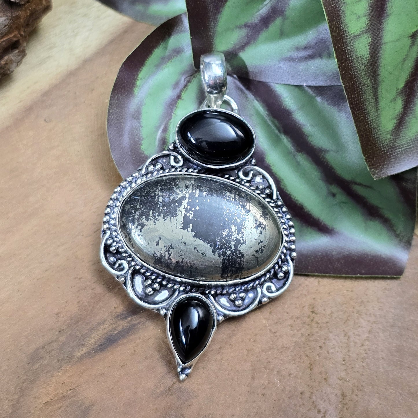 .925 Sterling Silber Anhänger, ovaler Apache Gold Pyrit & Schwarzer Onyx