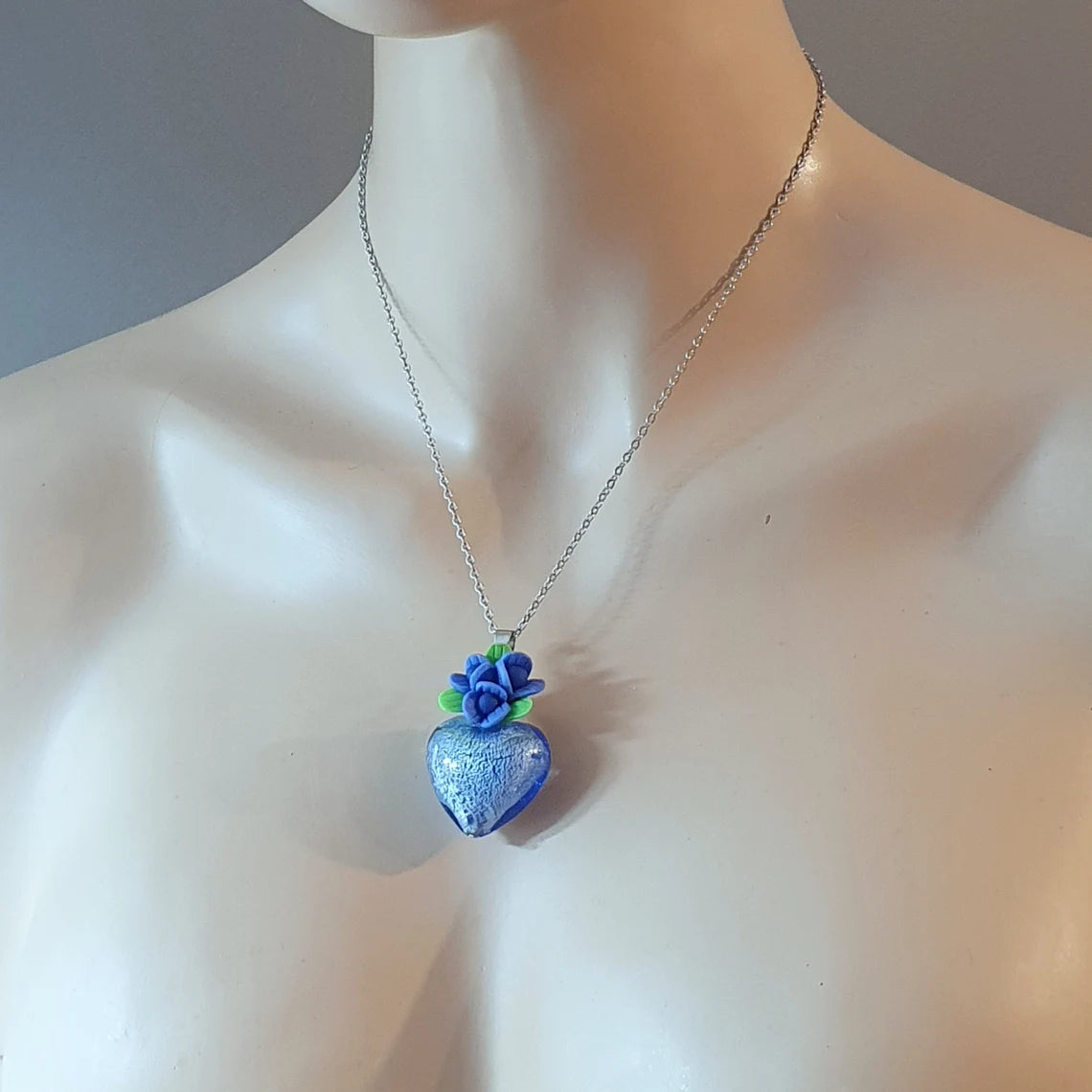 Anhänger blaues Herz aus Glas & Blume, Muranostil, an Edelstahlkette