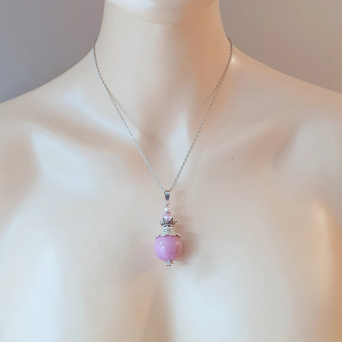 Anhänger Dajana, große Kugel, Malve, mit Krönchen und Glasperlen, an Edelstahlkette