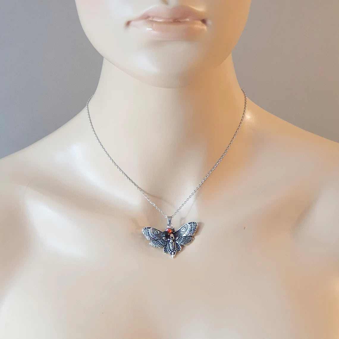 Anhänger Totenkopfschwärmer, Motte, mit Onyxkugel, an Edelstahlkette, Gothic, Wicca, Witchy
