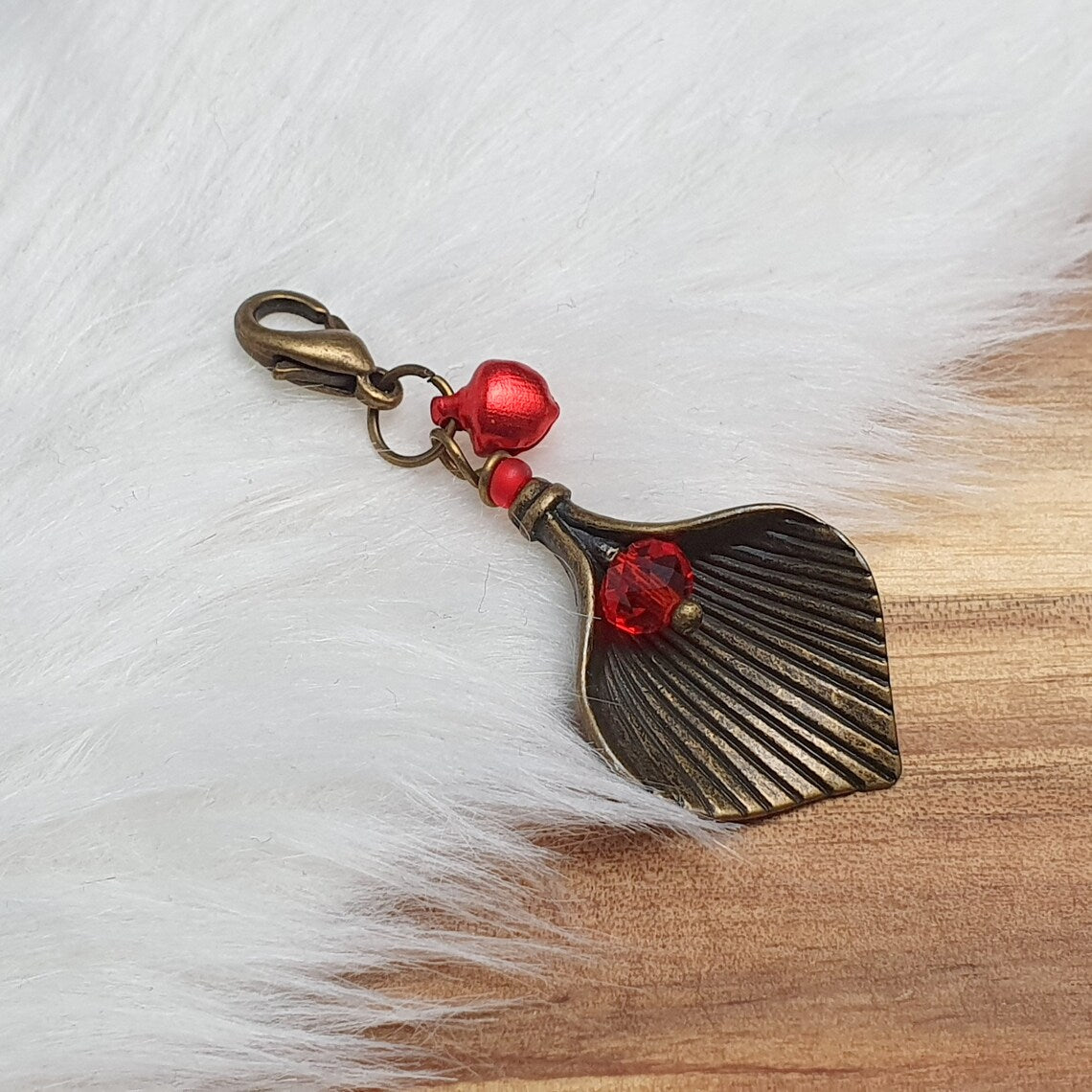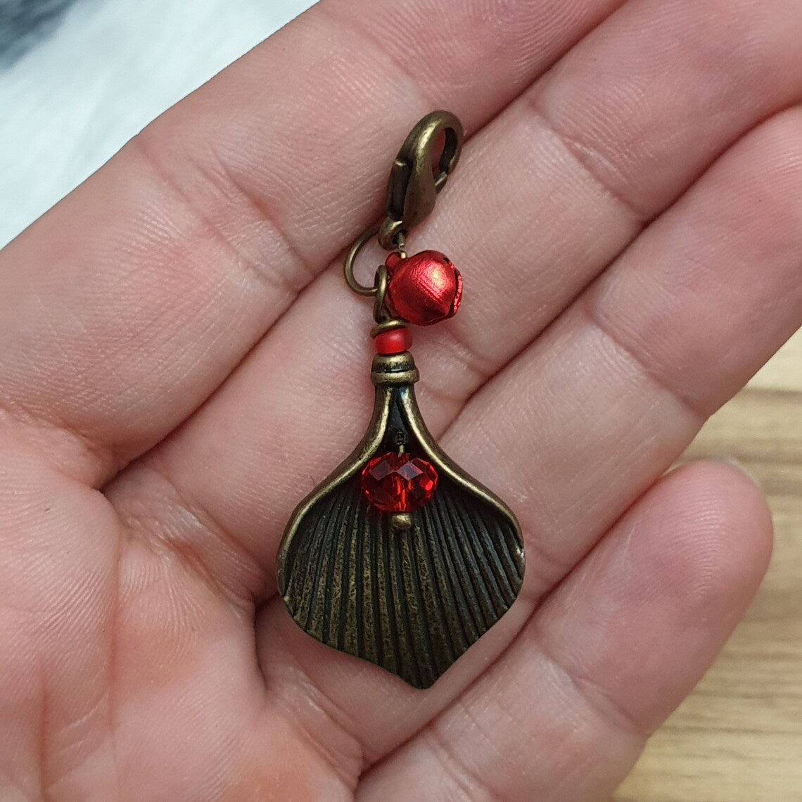 Mit einer roten Kristallglasperle, roter Preciosa Rocaille und einem roten Metallglöckchen.