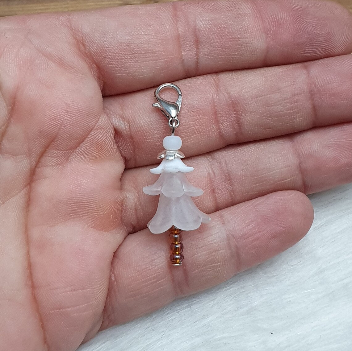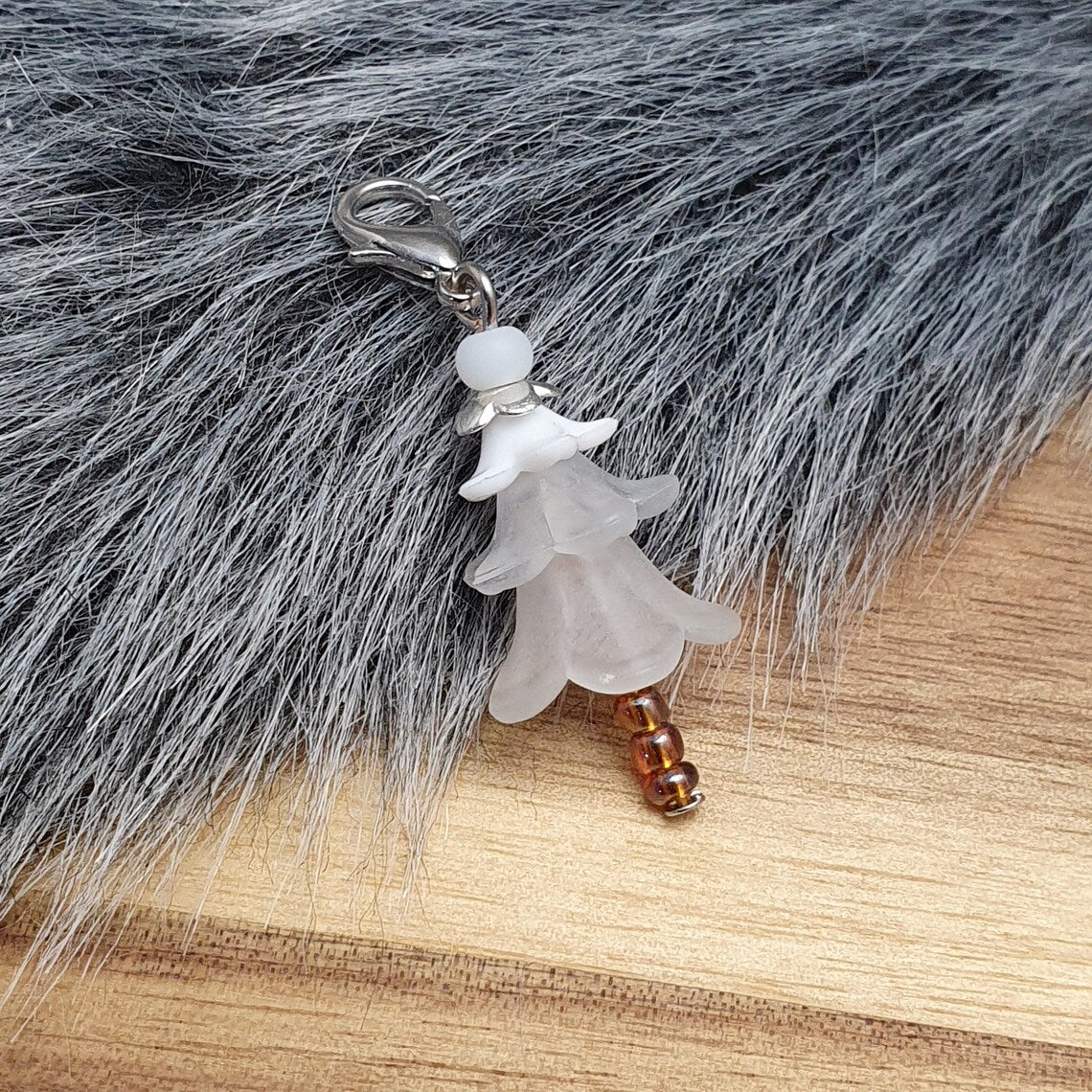 Gefertigt aus weißen Acrylkäppchen, braunen Rocailles und einer weißen Preciosa Rocaille.