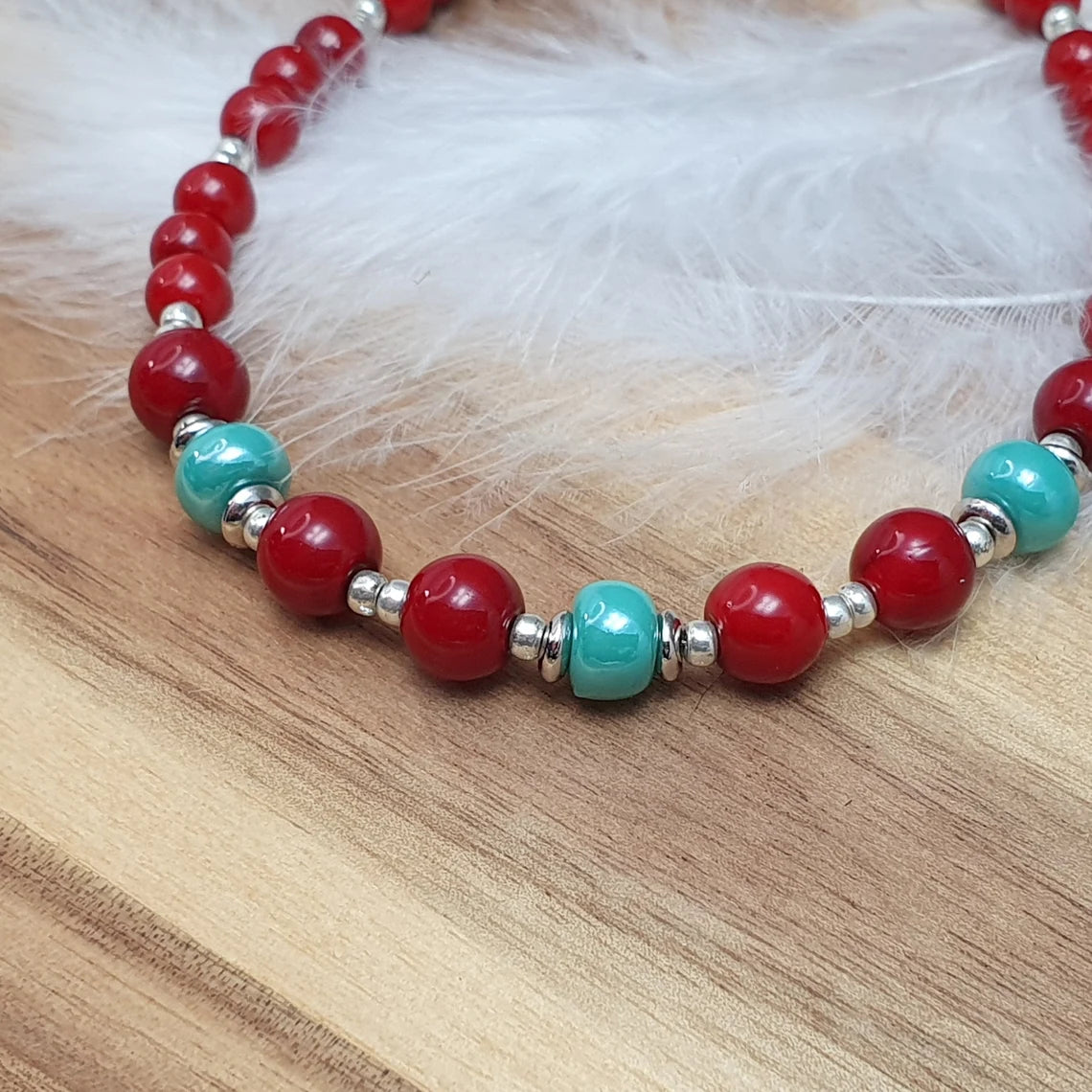 Die türkisblauen Preciosa Glasperlen setzen einen tollen Akzent zwischen den kirschroten Glasperlen.