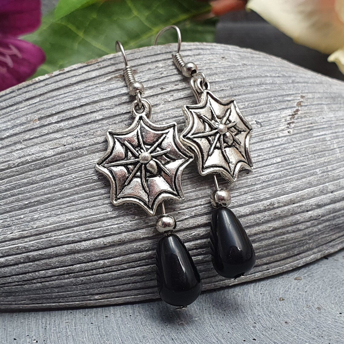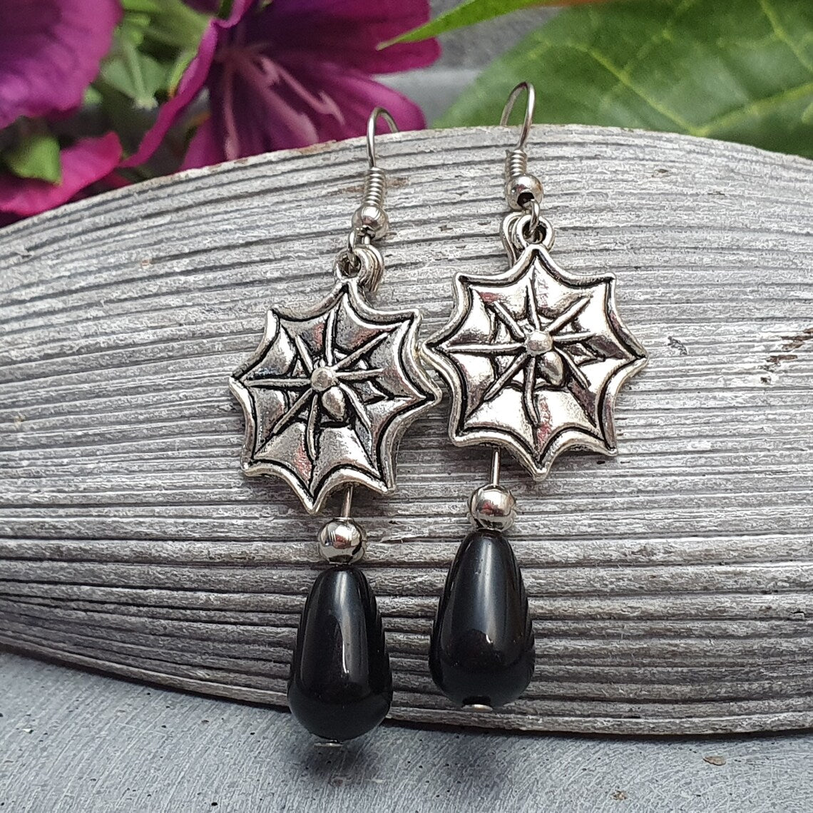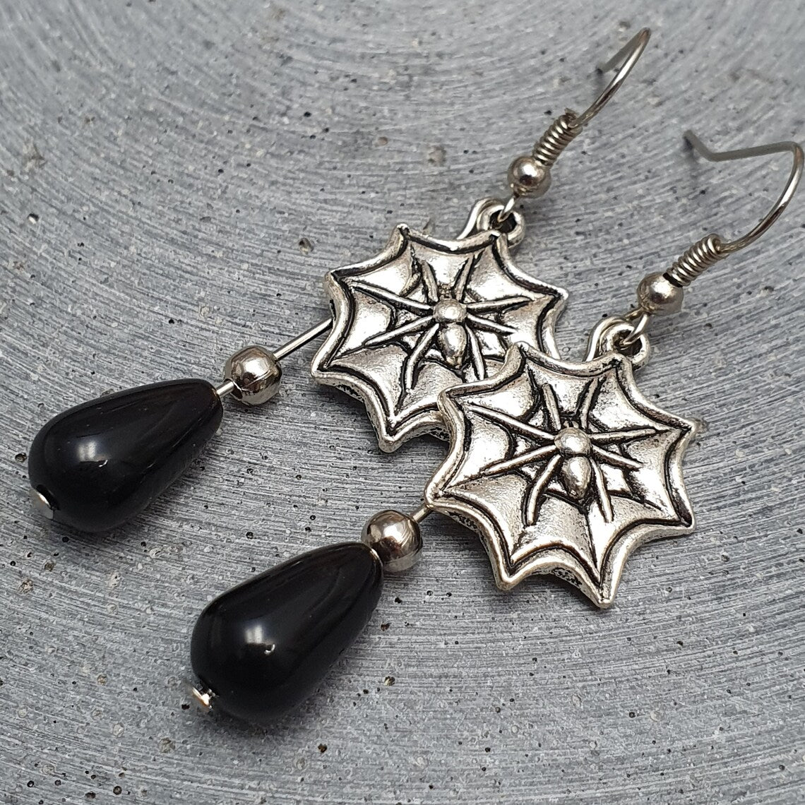 Ohrhänger mit Spinne im Net und glatten, schwarzen Glasperlen in Tropfenform.