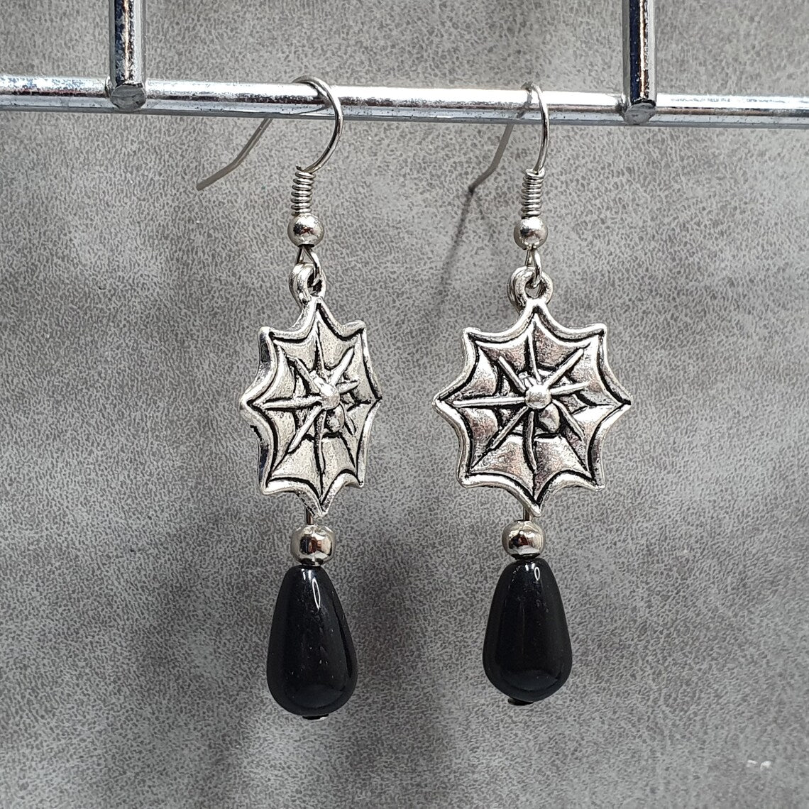 Gothic Ohrhänger mit Spinne im Netz, silberfarbig mit schwarzen Glastropfen