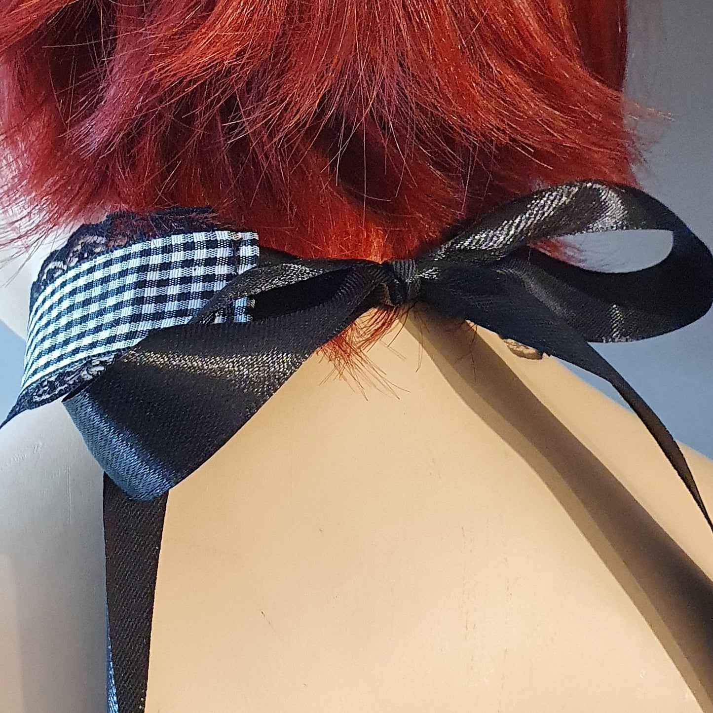 Das Halsband wird mit Satinband (single Face) im Nacken geknotet und hat keinen Verschluss.