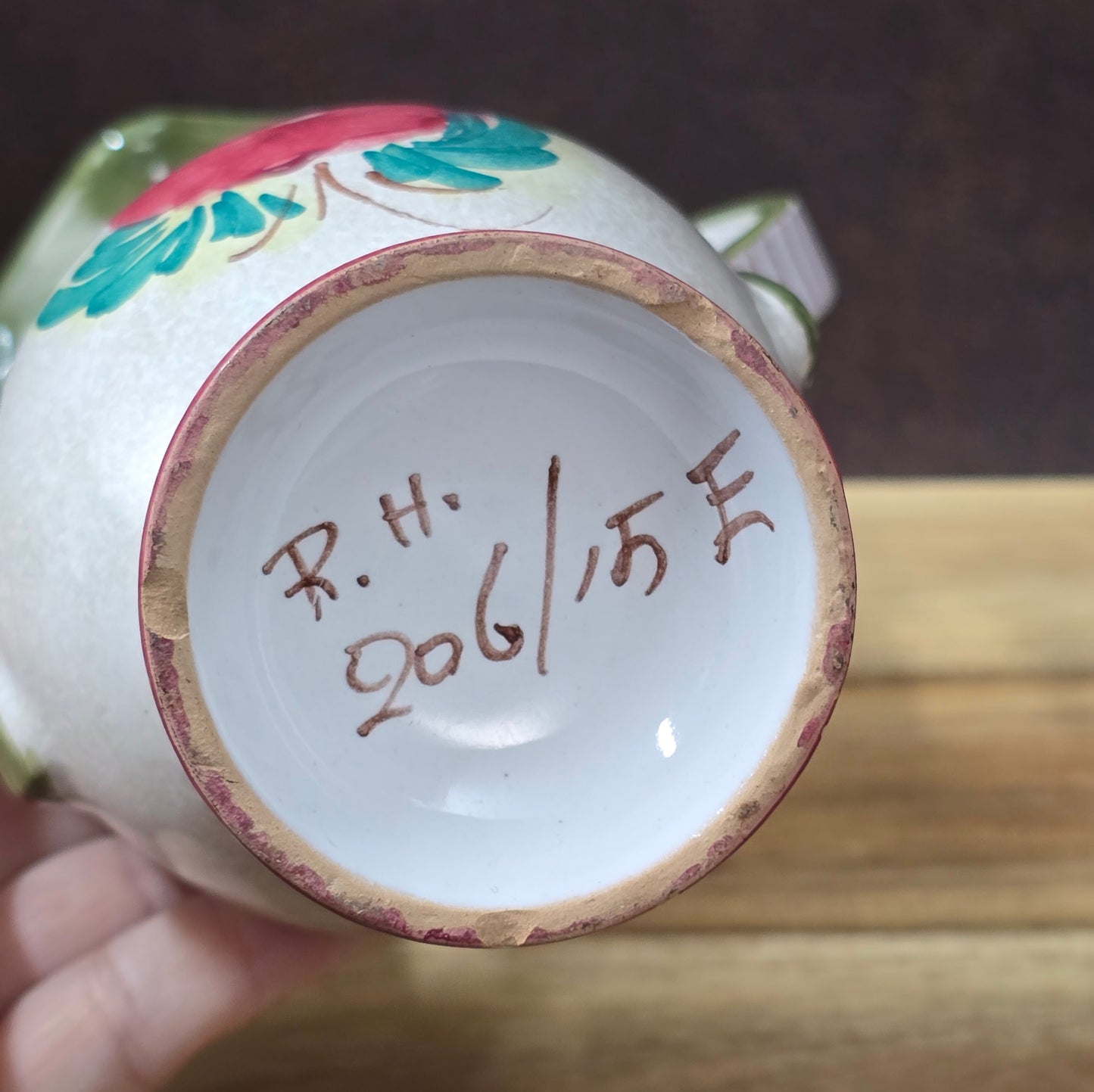 Diese italienische Amphoren-Vase bringt mediterranes Flair direkt in dein Zuhause. Handbemalt mit kräftigen floralen Motiven, vereint sie den unverwechselbaren Charme der 1950er/1960er Jahre mit klassischer Mid-Century-Formensprache. Das Craquelé und die Signatur am Boden machen jedes Stück zu einem Unikat – perfekt, um deinem Interieur Wärme, Farbe und Charakter zu verleihen.