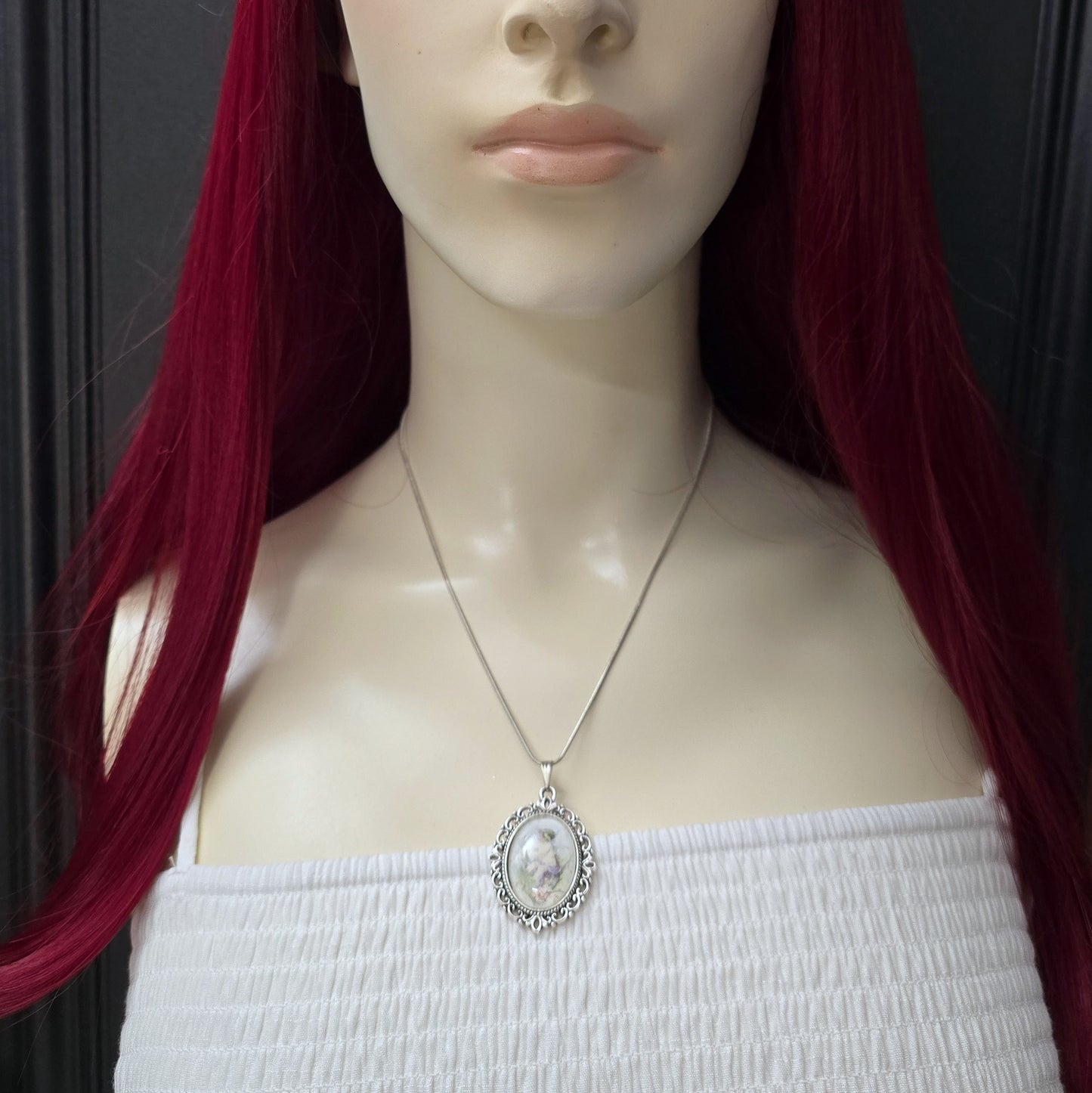 Der ovale Glascabochon ist mit einem Motiv verziert, dass einen kleinen Engel zeigt (Cherub-Motiv) im Vintage-Postkartenmotiv. Die Verschnörkelungen des Anhänger passen thematisch wunderbar zum romantisch nostalgischen Motiv des Cabochons.
