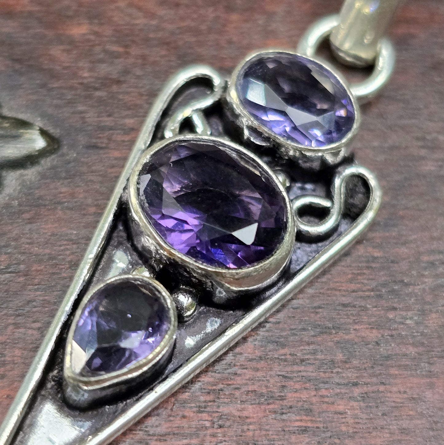 Ein außergewöhnlicher Anhänger in prägnanter Dreiecksform, gefertigt aus erlesenem .925 Sterling Silber und kunstvoll verziert mit drei magischen Amethysten. Dieses exklusive Schmuckstück vereint die Mystik des Gothic-Stils mit der natürlichen Eleganz der Amethyst-Edelsteine und lädt dazu ein, in die Tiefen von Spiritualität und Symbolik einzutauchen.