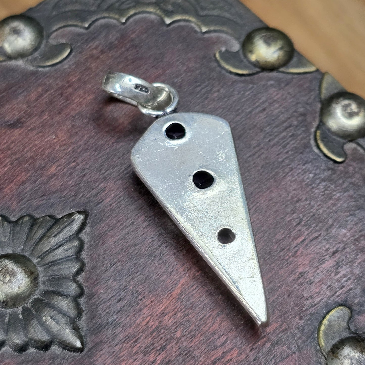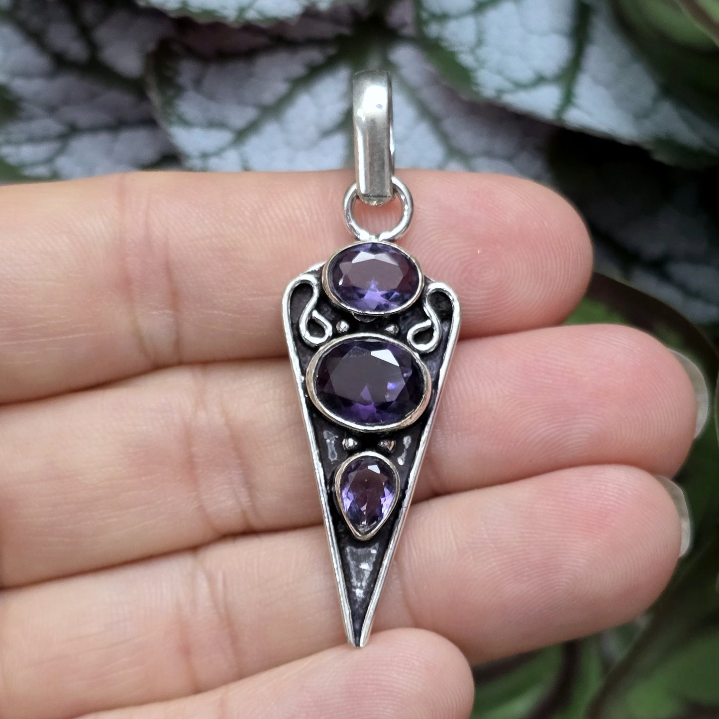 Kettenanhänger aus .925 Sterling Silber mit Amethysten, gestaltet im Ethno-Stil in Form einer Pfeilspitze.