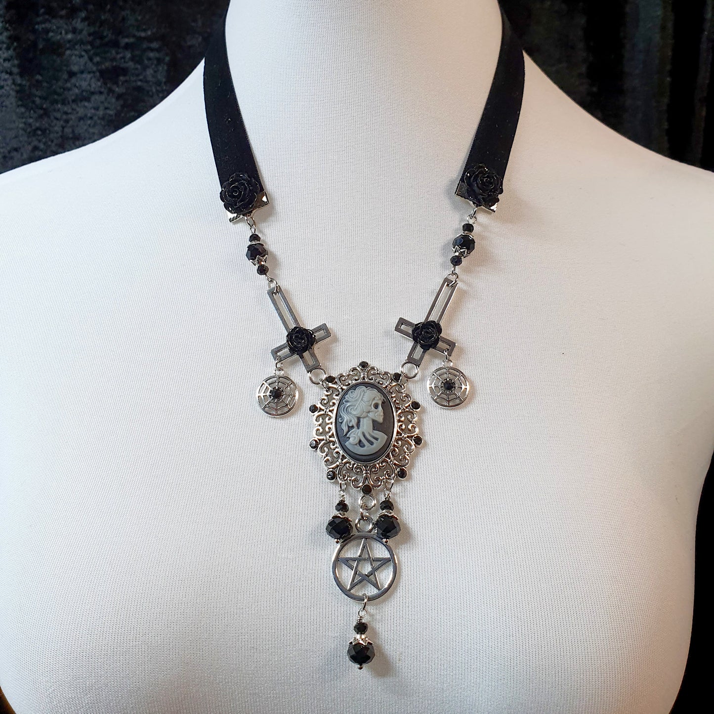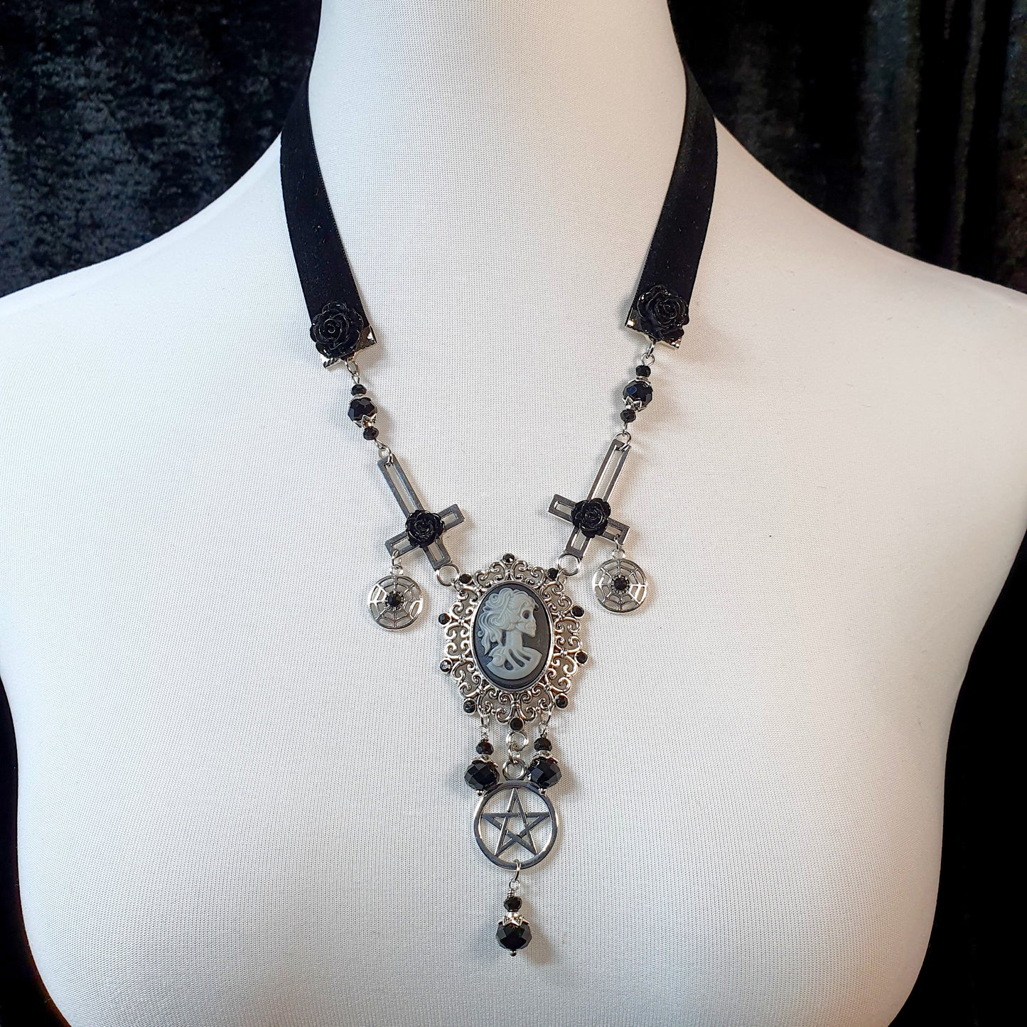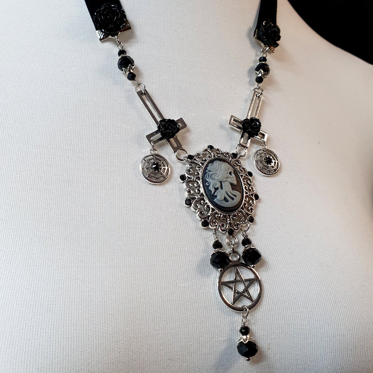 Mit vielen silberfarbigen Metallelementen, schwarzen Kristallglasperlen, Strass, schwarze Rosen aus Resin und einem Cabochon aus Resin. Die kette besteht im oberen Teil aus schwarzem Samtband.
