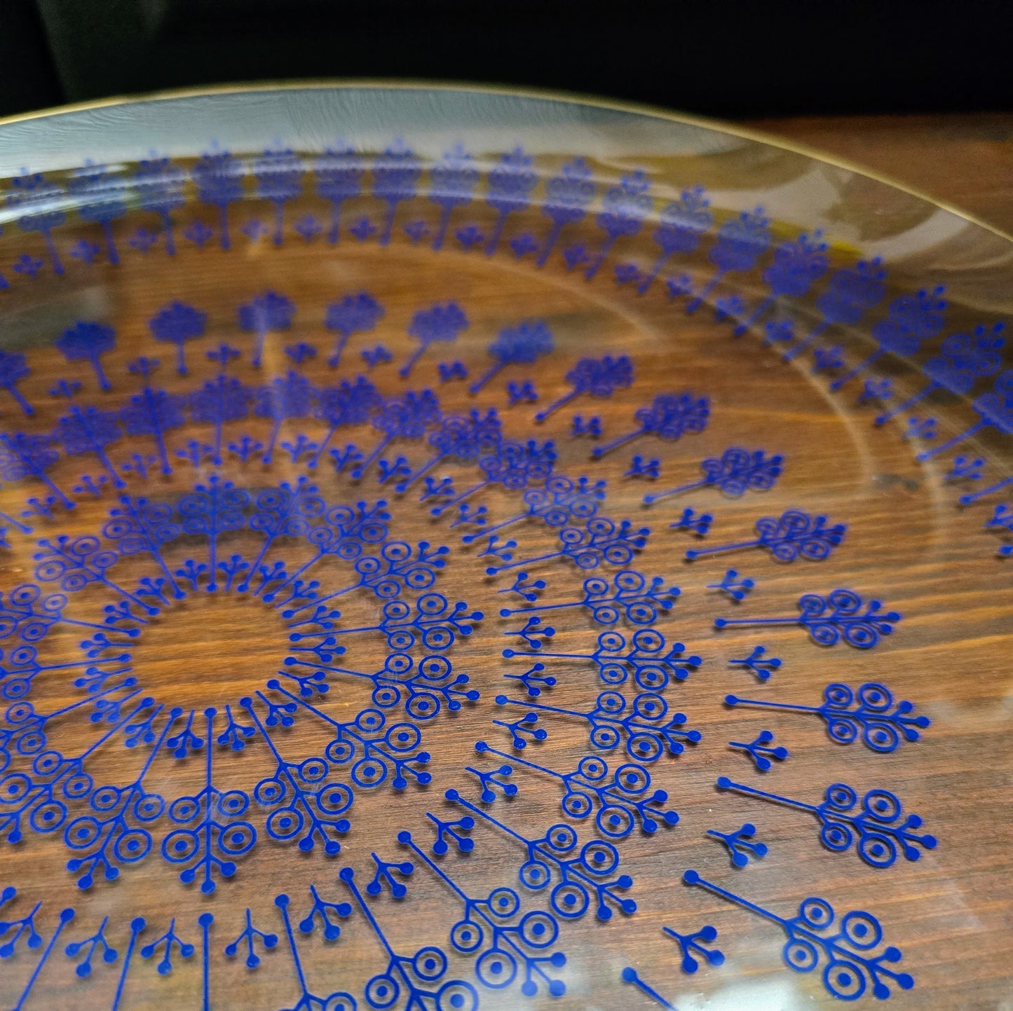 Kuchenplatte VEB Thermoform Olbernhau - mit blauem Muster & Goldrand – 1970er – Ø 31 cm – Servierplatte DDR Glas