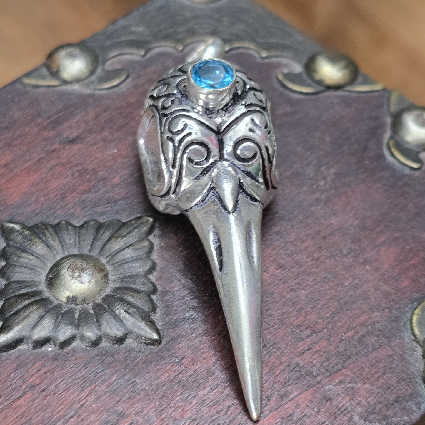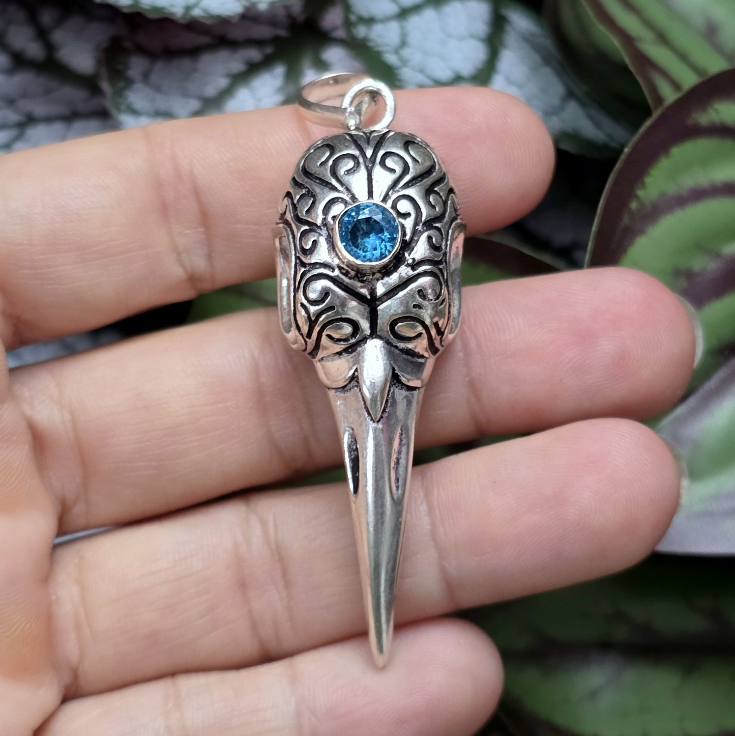Mystischer Rabenschädel-Anhänger aus .925 Sterling Silber mit Aquamarin – Gothic Schmuck, Biker, Rockabilly, Kitsch