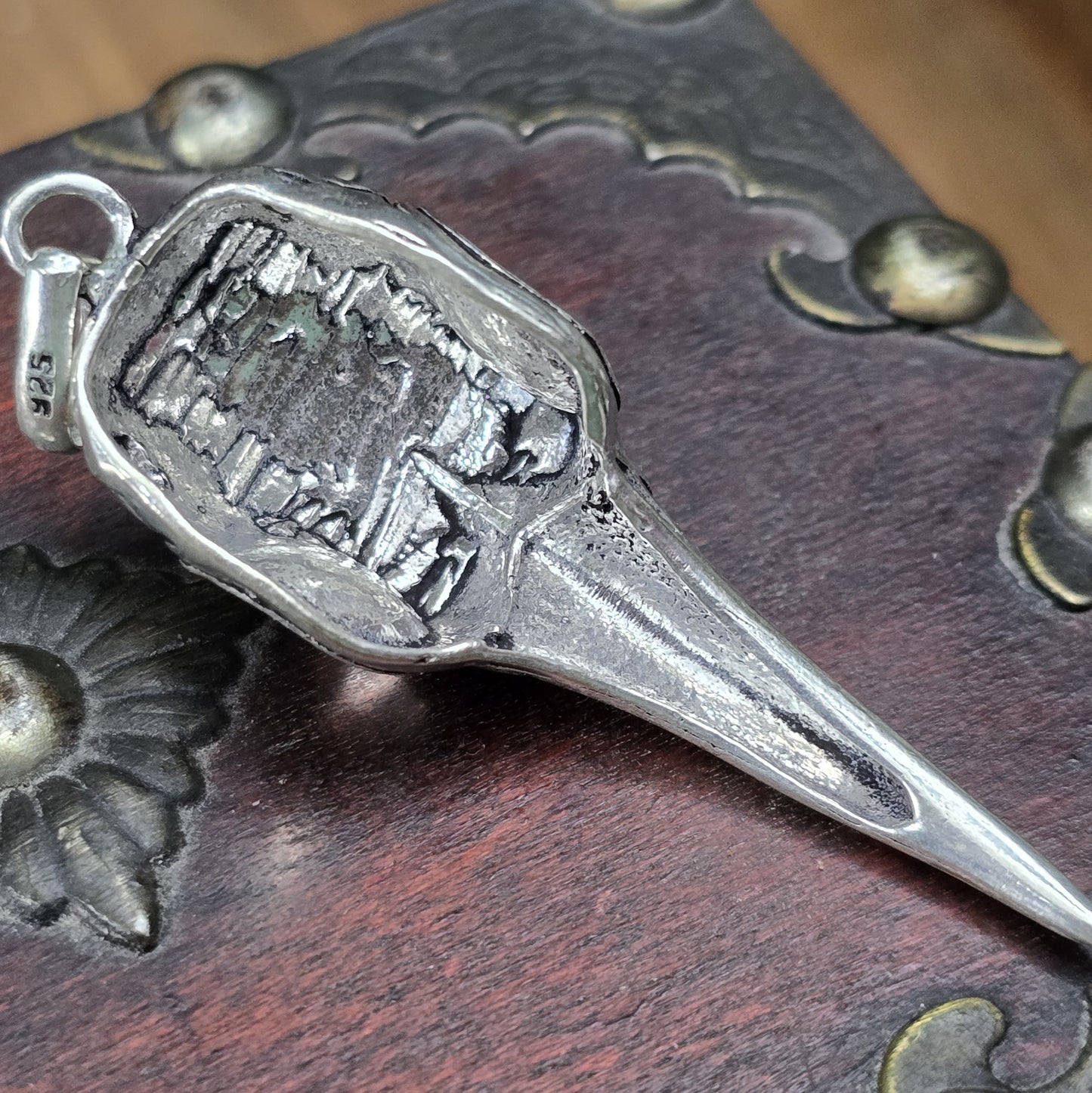 Der Rabenschädel, ein mächtiges Symbol für Weisheit und die Verbindung zwischen der physischen und spirituellen Welt, ist mit viel Liebe zum Detail gestaltet. Gefertigt aus Sterling Silber, ist der Anhänger innen hohl, was ihn trotz seiner imposanten Größe angenehm leicht macht.
