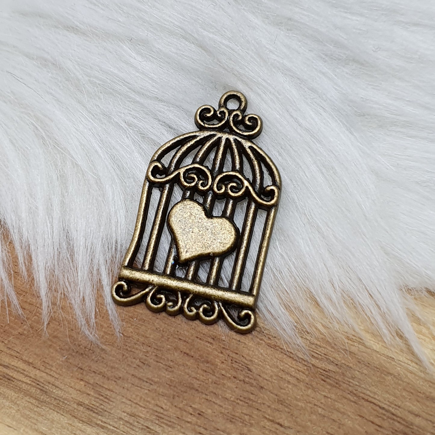 Der Anhänger besteht aus einer Zinklegierung und ist mit wunderschönen Details verziert. Allerdings sitzt in diesem Vogelkäfig kein Vögelchen, sondern ein Herz. Die antik bronzefarbige Optik verleiht dem Anhänger eine edle und zeitlose Ausstrahlung.