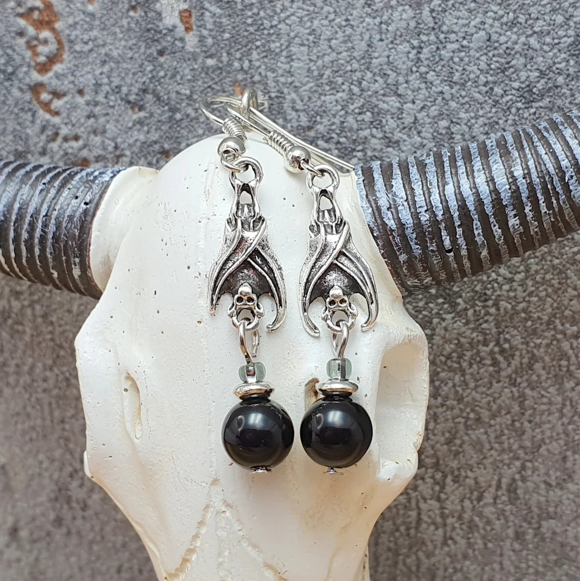 Ohrhänger, Fledermäue mit schwarzen Onyxkugeln, Gothic, Vampire