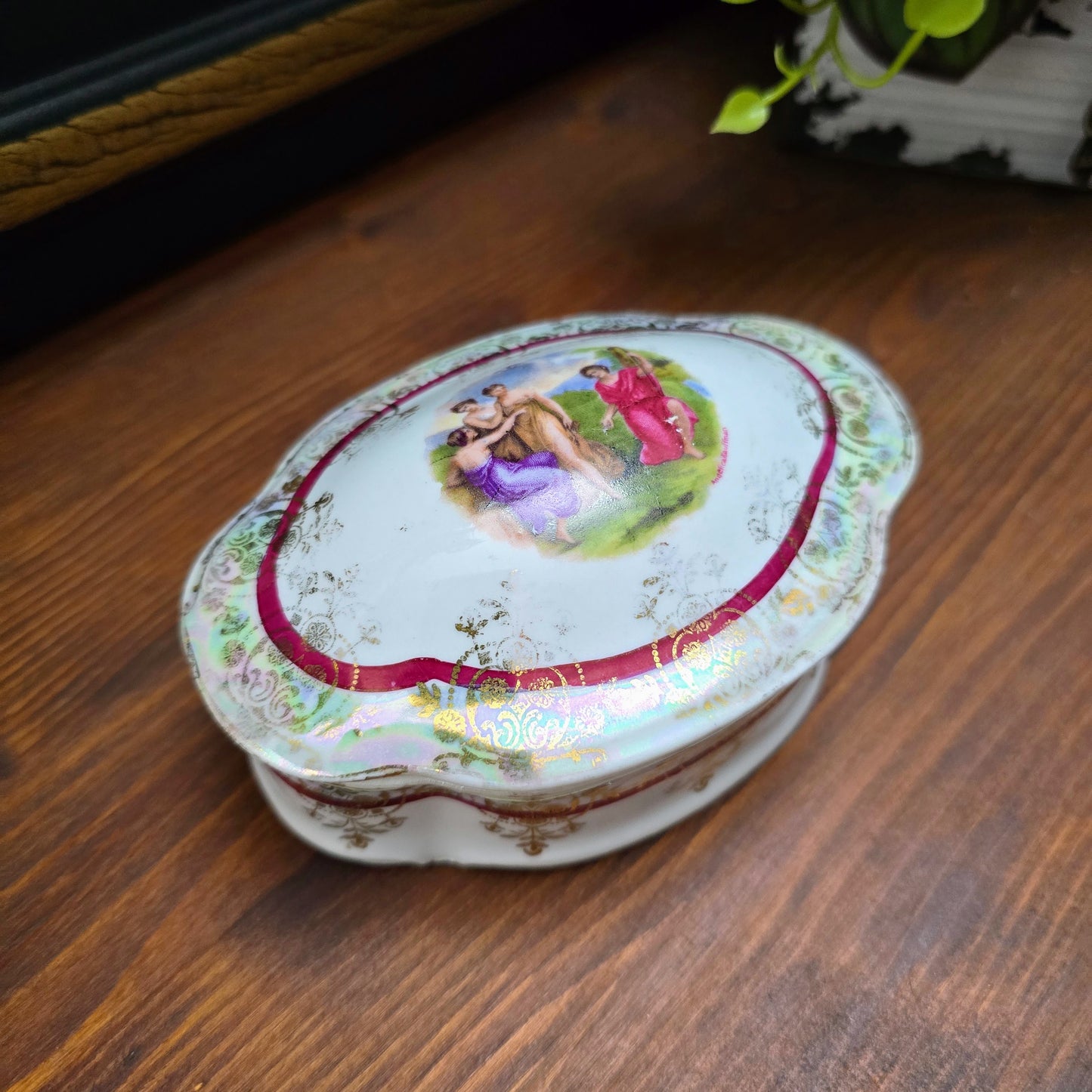 Feine Vintage-Porzellandose von Ilmenau Graf von Henneberg aus den 1960er Jahren. Das ovale Schmuckstück zeigt eine klassische altrömische Szene mit drei Damen und einem Herren, umrahmt von Golddekor und einem roten Akzentstreifen.