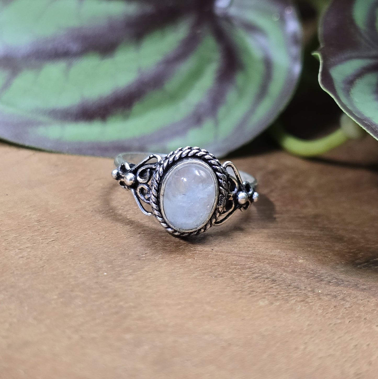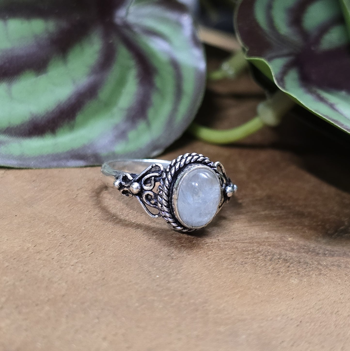 Der Regenbogen-Mondstein symbolisiert innere Erleuchtung und spirituelle Klarheit. Als Stein der Transformation hebt er das Bewusstsein auf eine höhere Ebene und verbindet den Träger mit den geheimen Kräften der Natur und des Universums. Der schimmernde Glanz des Mondsteins zieht den Blick an und vermittelt das Gefühl, dass der Ring den Träger zu einem Ort führt, an dem Zeit und Raum keine Bedeutung mehr haben.