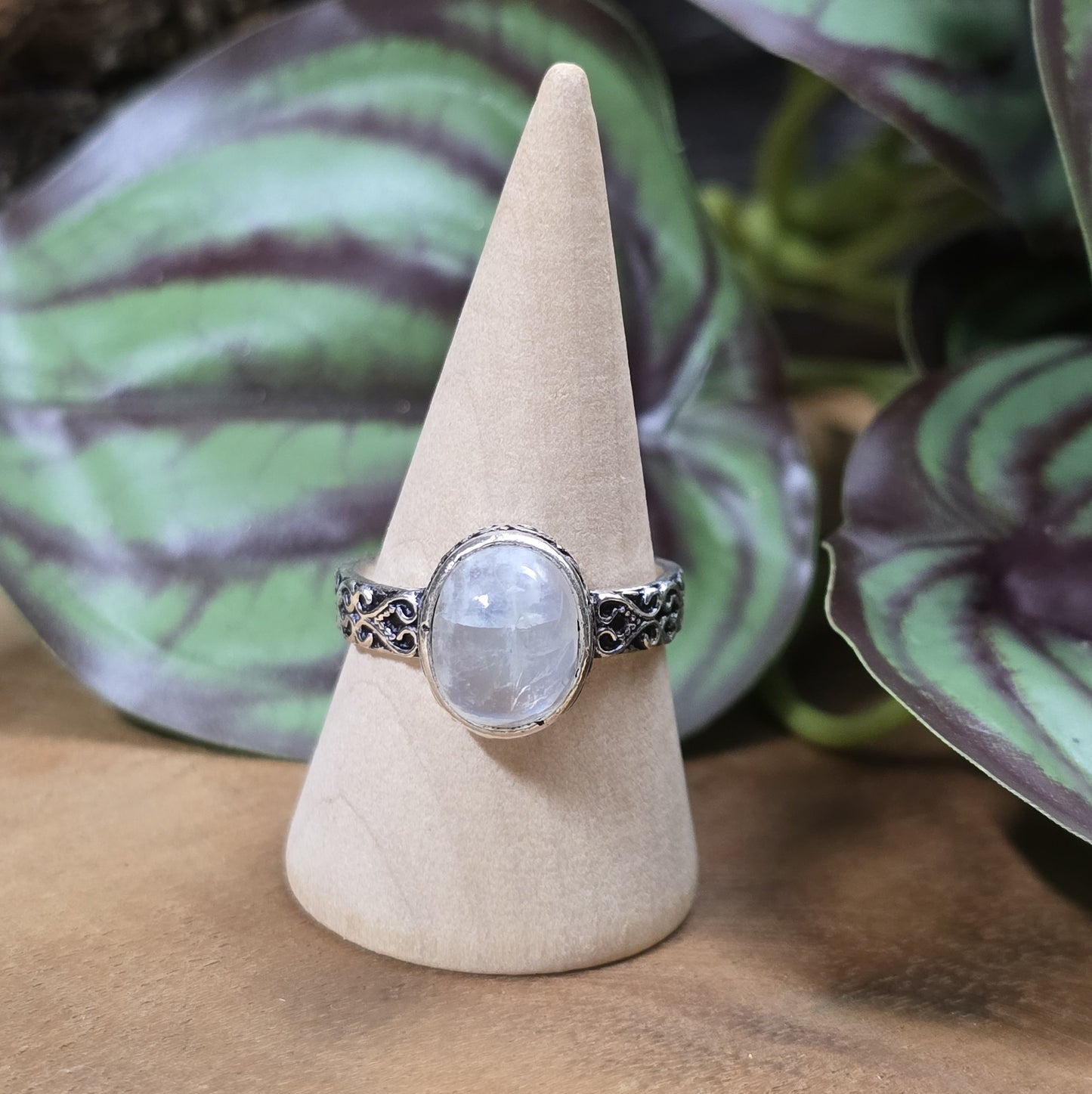 Der Regenbogen-Mondstein ist ein Symbol der inneren Erleuchtung und der spirituellen Klarheit. Er ist ein Stein der Transformation, der das Bewusstsein auf eine höhere Ebene hebt und den Träger mit den geheimen Kräften der Natur und des Universums verbindet. Der sanfte Glanz des Mondsteins zieht den Blick an und weckt das Gefühl, als würde der Ring den Träger zu einem Ort führen, an dem Zeit und Raum keine Bedeutung mehr haben.