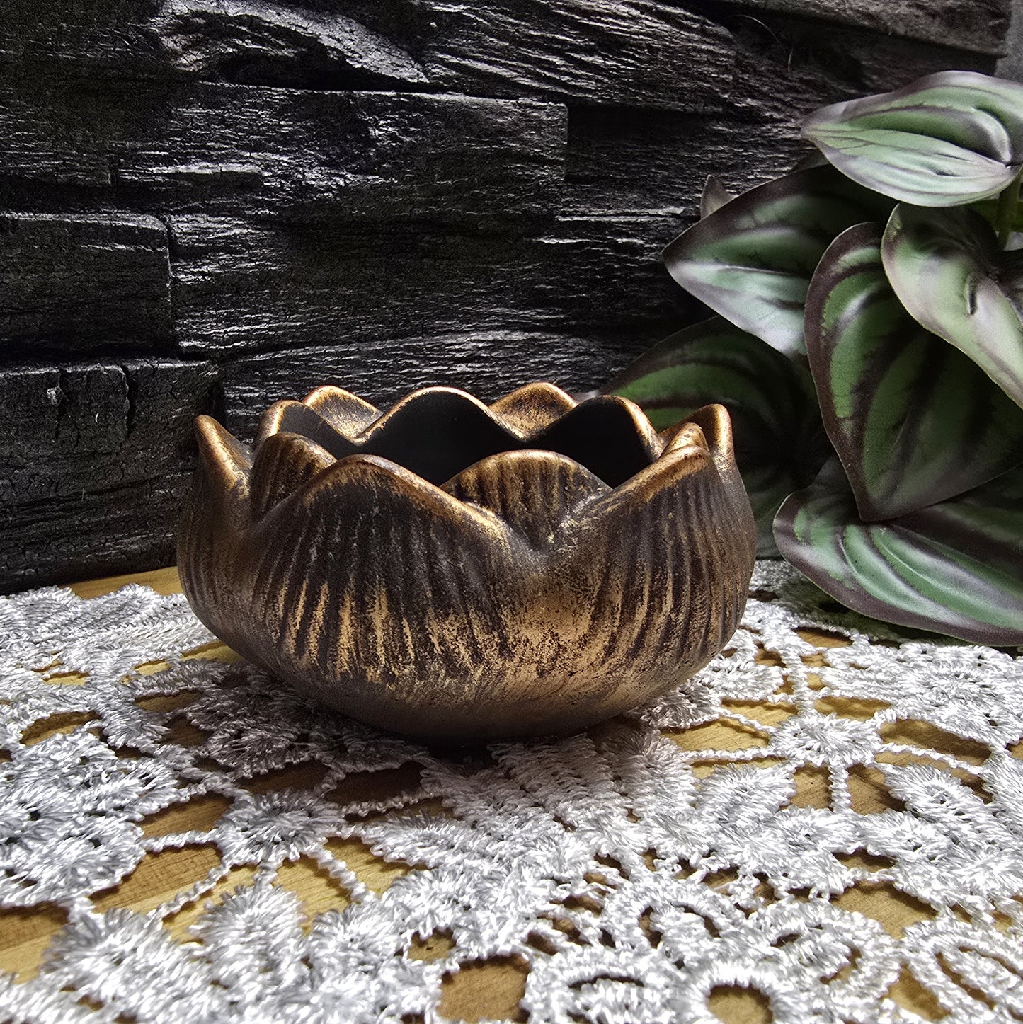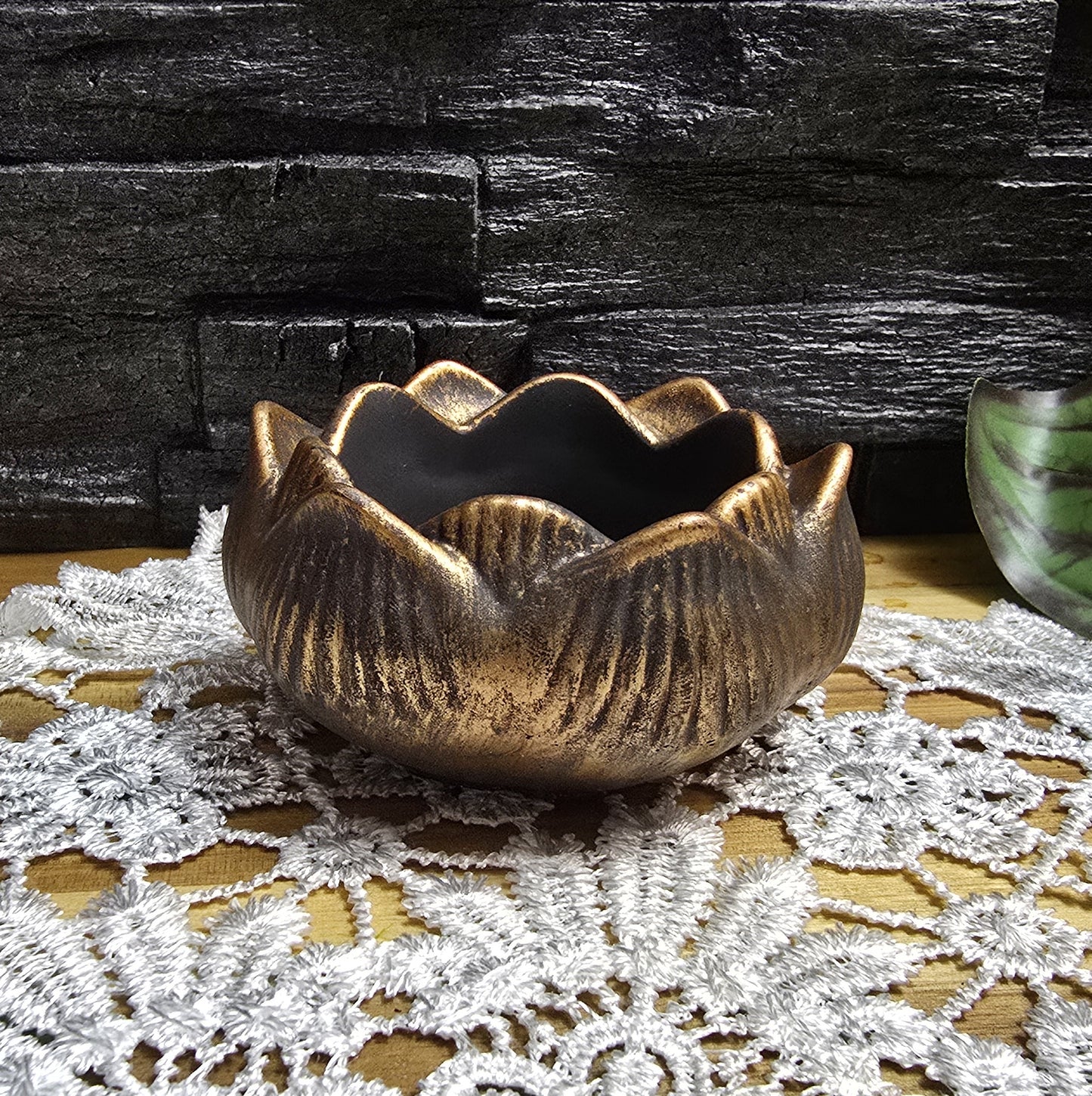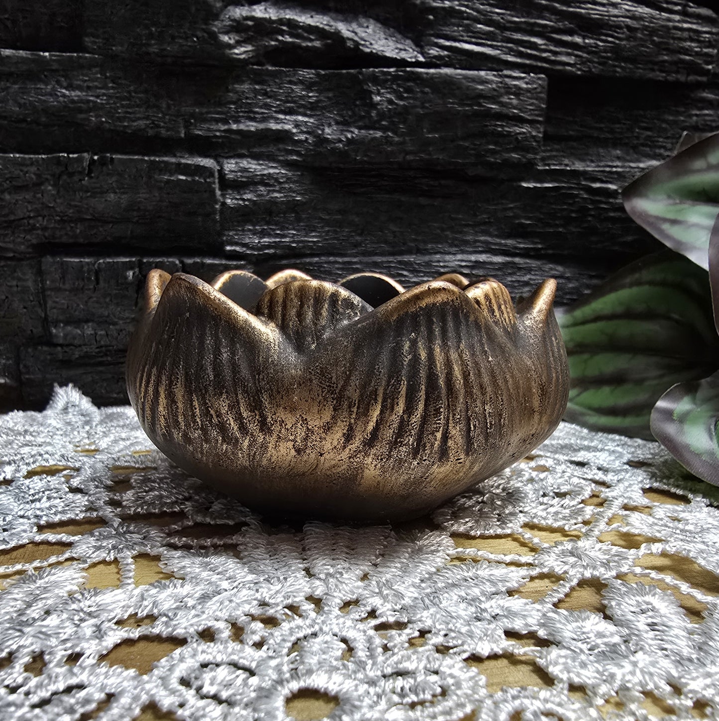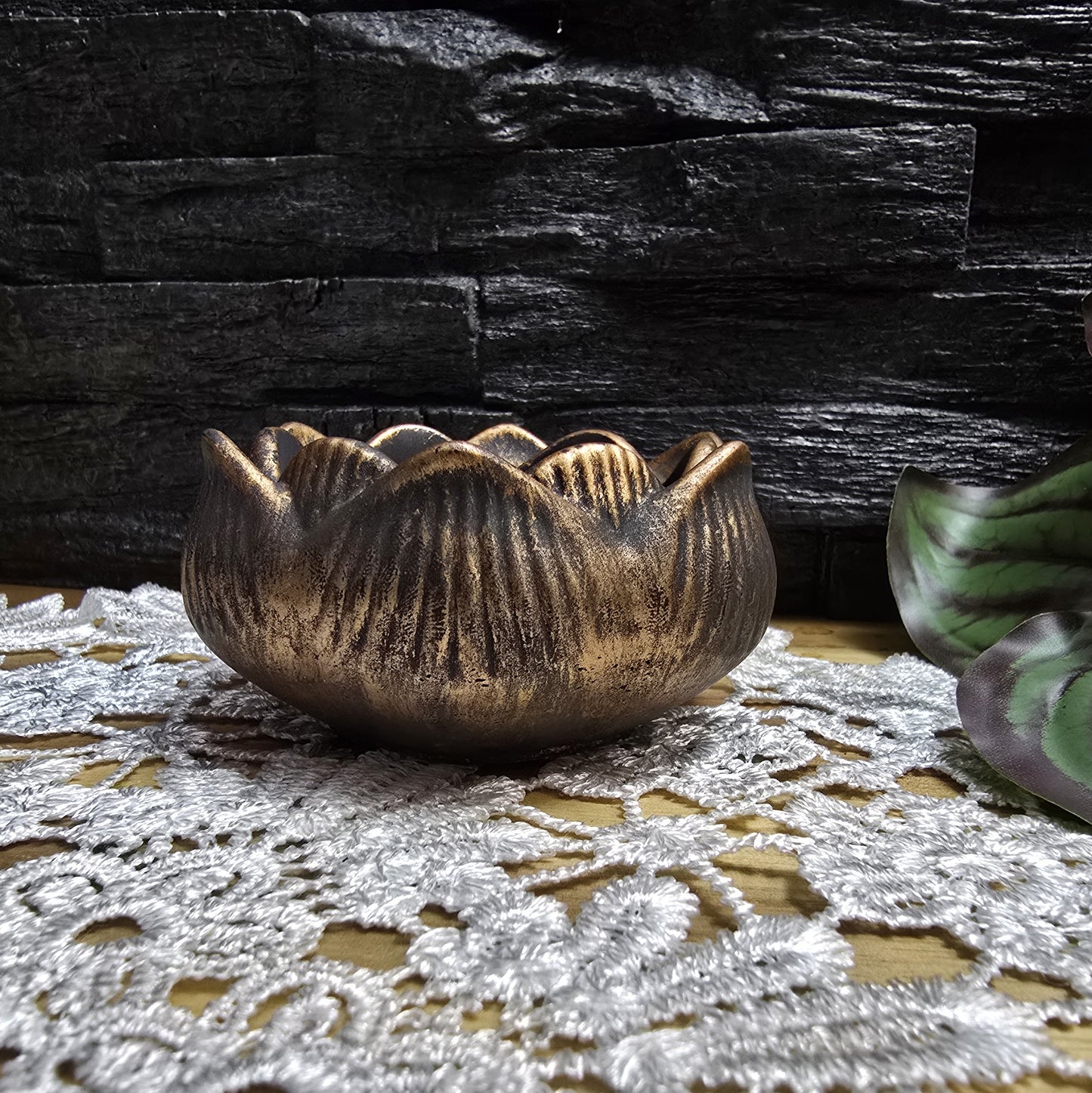 Teelichthalter Lotusblüte aus schwarzem Keraquick, mit einem Finish aus warmem Gold