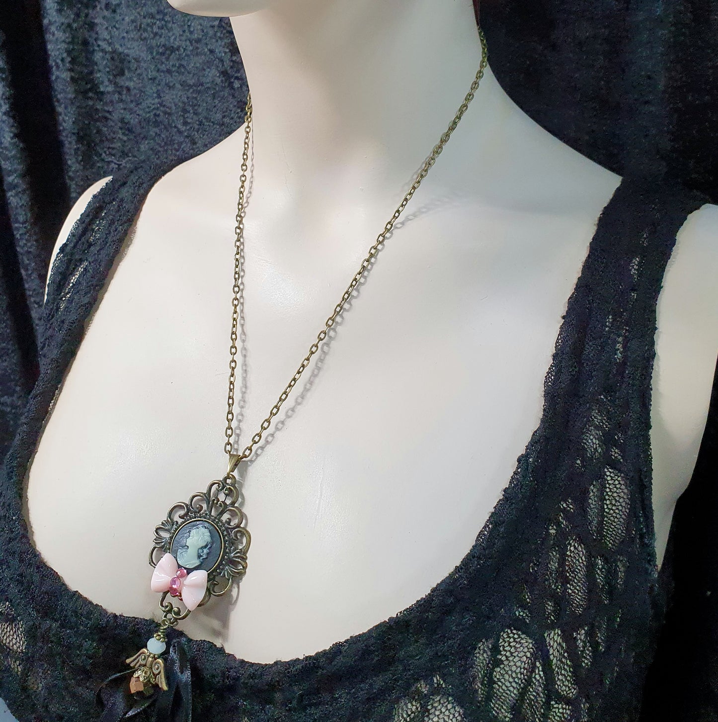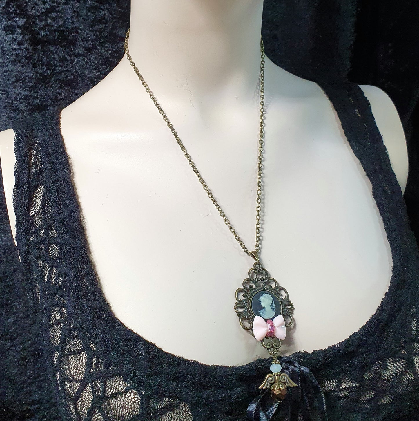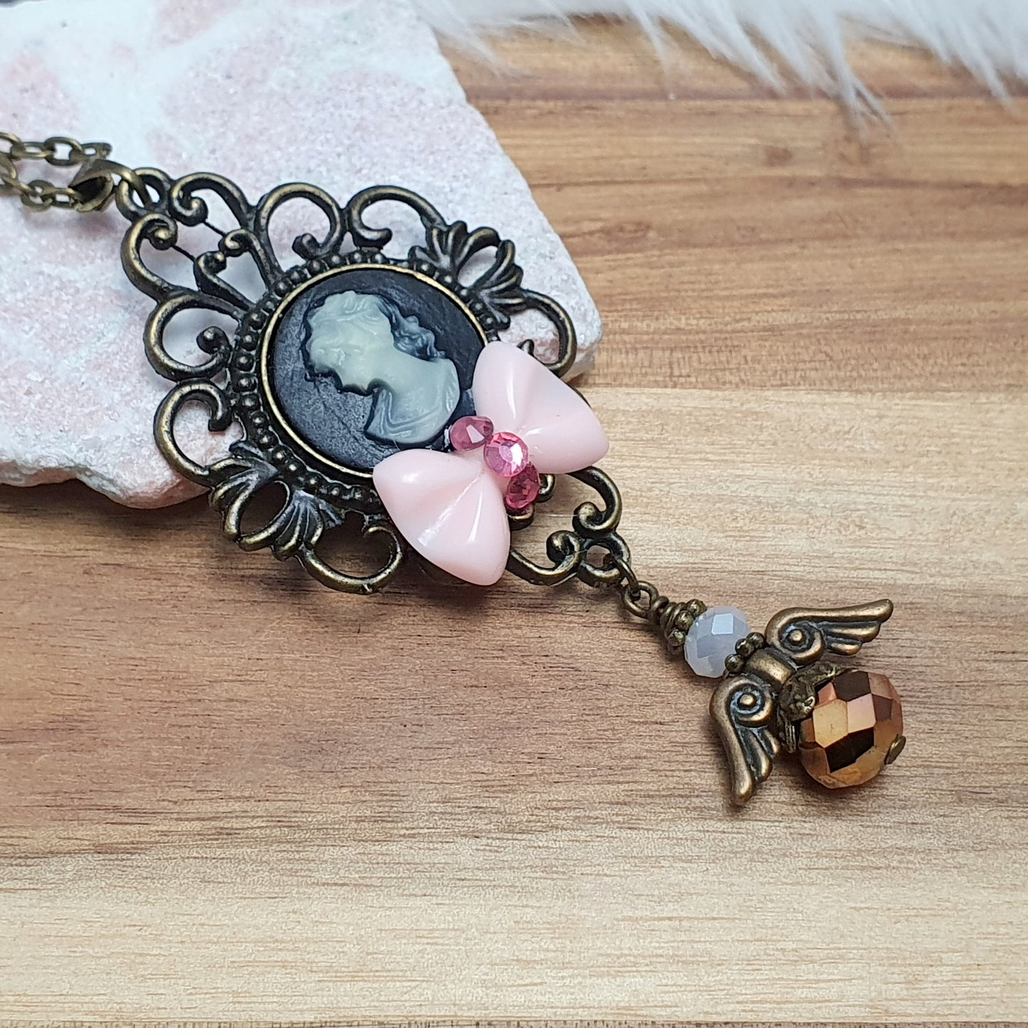 Anhängerkette mit Kamee, Schleife & Perlenengel.