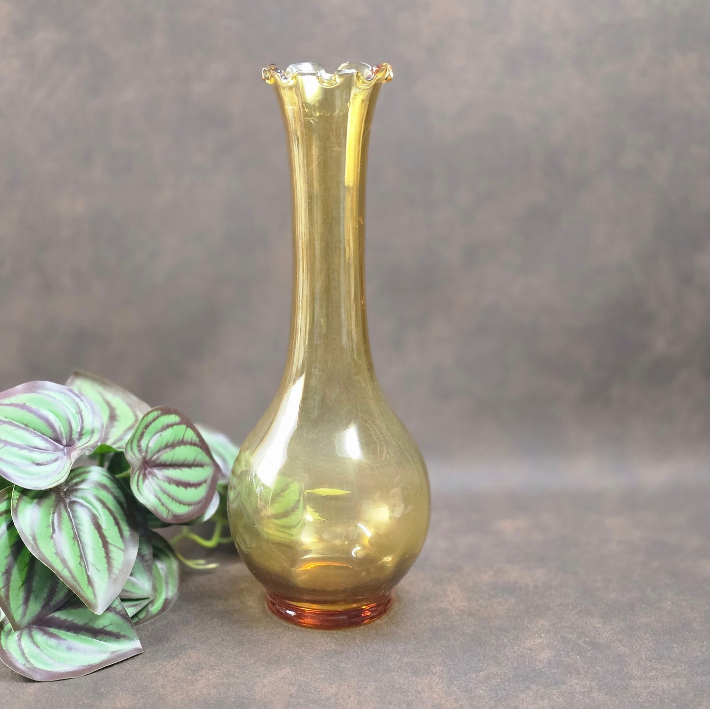 Vintage Lauscha Bernsteinglas Vase • DDR 70er • Mundgeblasen 25 cm • Rüschenrand • Retro Wohndeko