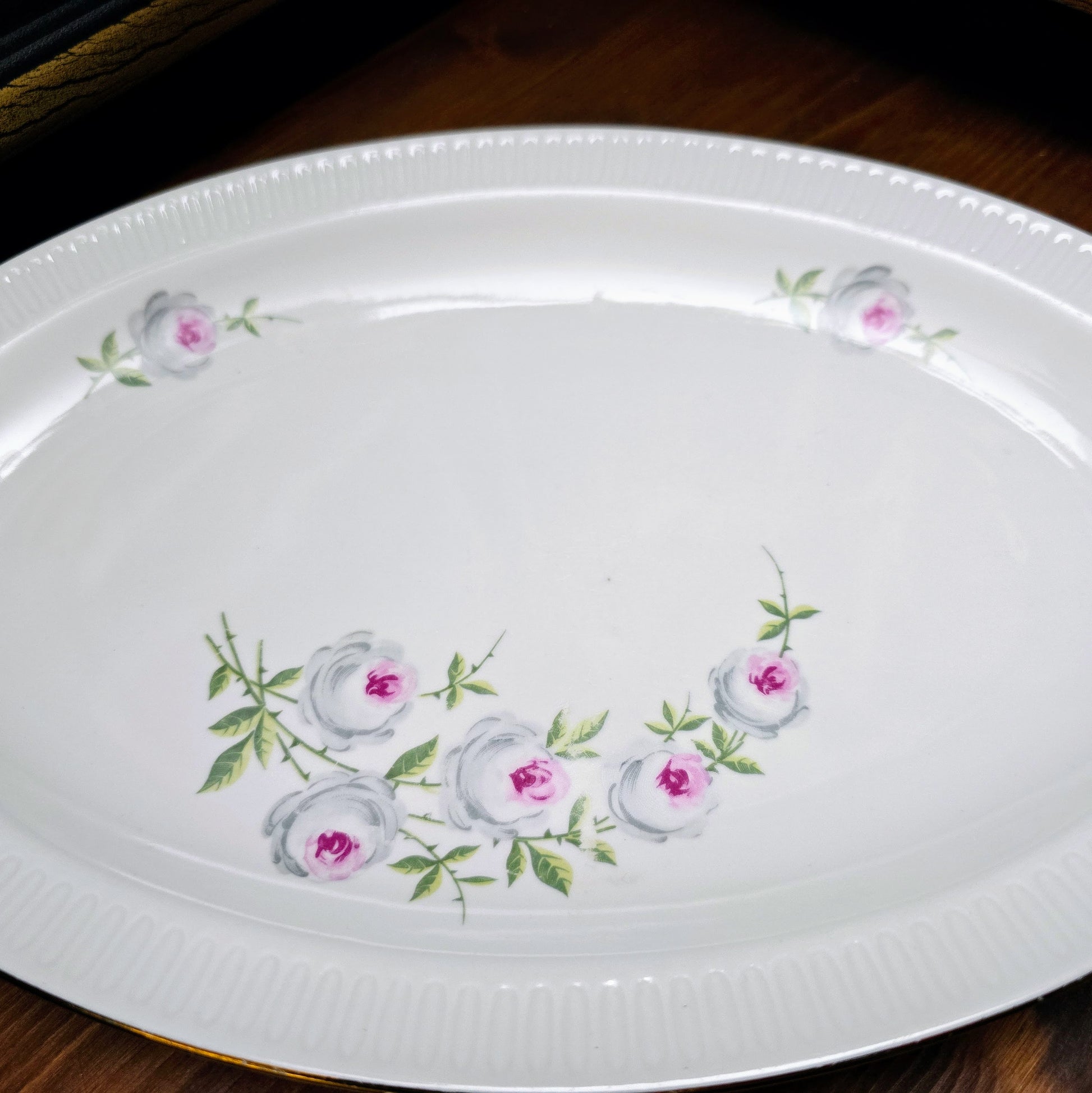 Diese längliche Servierplatte mit nostalgischem Rosenmotiv wurde in den 60er/70er Jahren in der DDR von Stadtlengsfeld Porzellan gefertigt. Ideal zum stilvollen Servieren von Gebäck, Fleisch oder Käseplatten – oder als dekoratives Vintage-Stück auf dem Buffet.